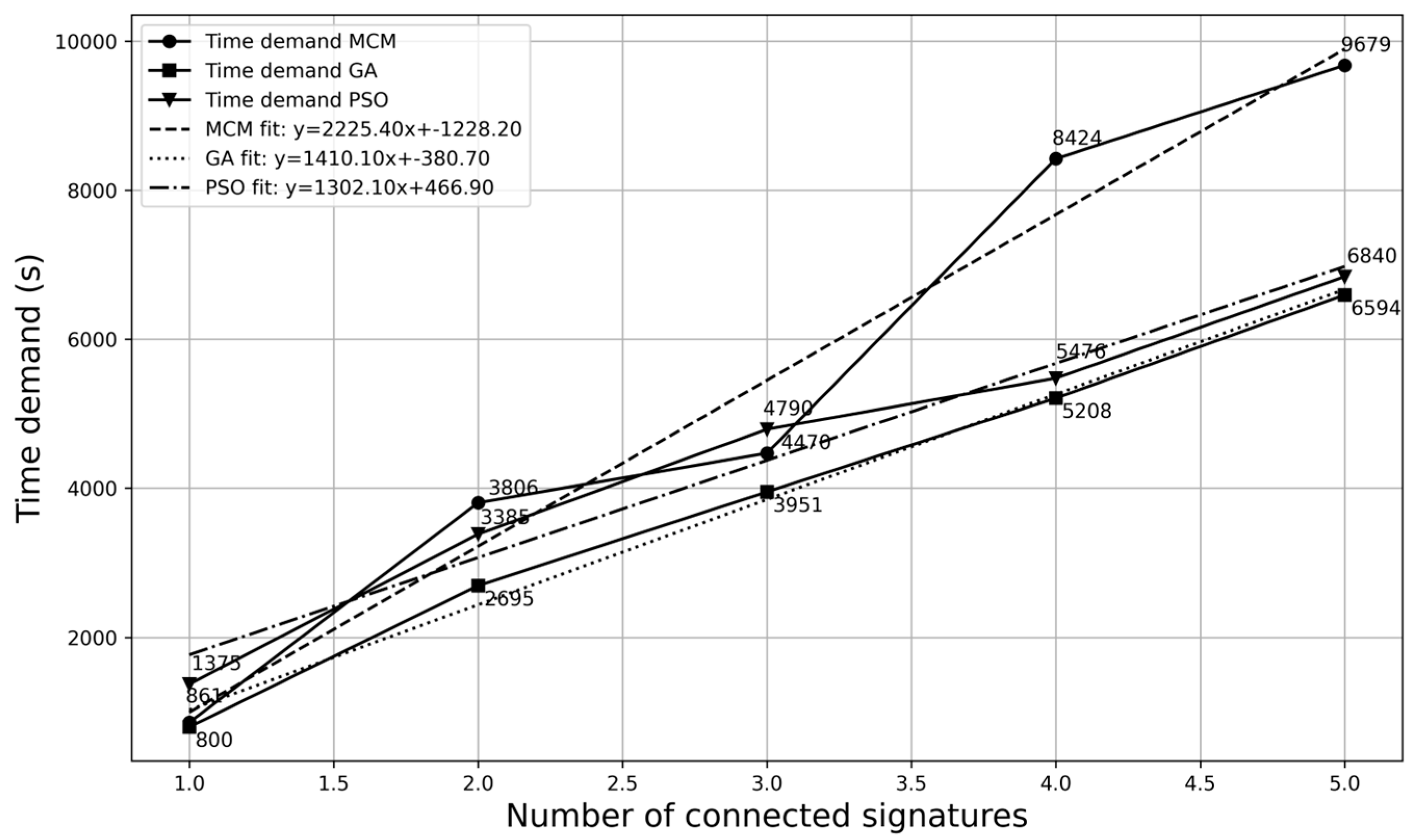 Figure 7 shows the time demands of optimizations depending on the number of connected signatures. The tests were run on 10 threads parallelly. The figure shows an increasing difference between the time demands of the different methods. The optimizations were tested on five assembled signatures at most, but the last two are not presented in this paper for practical reasons. The slopes of regression lines show that MCM time demands increase more than one and a half times faster than the GA or PSO demands. It is also shown that while the GA’s and PSO’s time demand increases approximately linearly depending on the number of connected signatures, this provides predictability for further tests. For larger models, the regressions show that PSO would need less time. The MCM time demand is far from a linear increase: it shows a sinusoidal increment.
