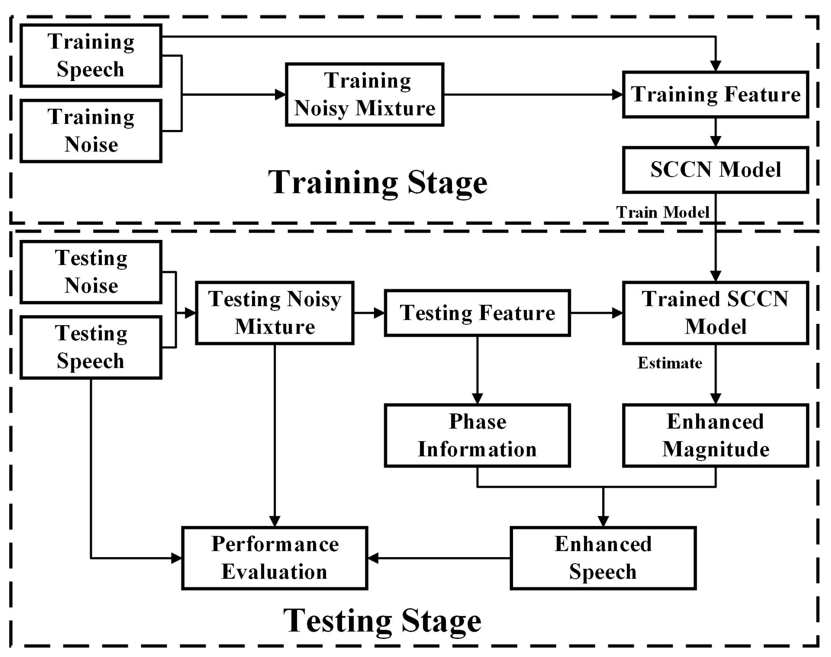 Figure 1. Block diagram of speech enhancement process based on the proposed SCCN model, showing the training and testing stages.