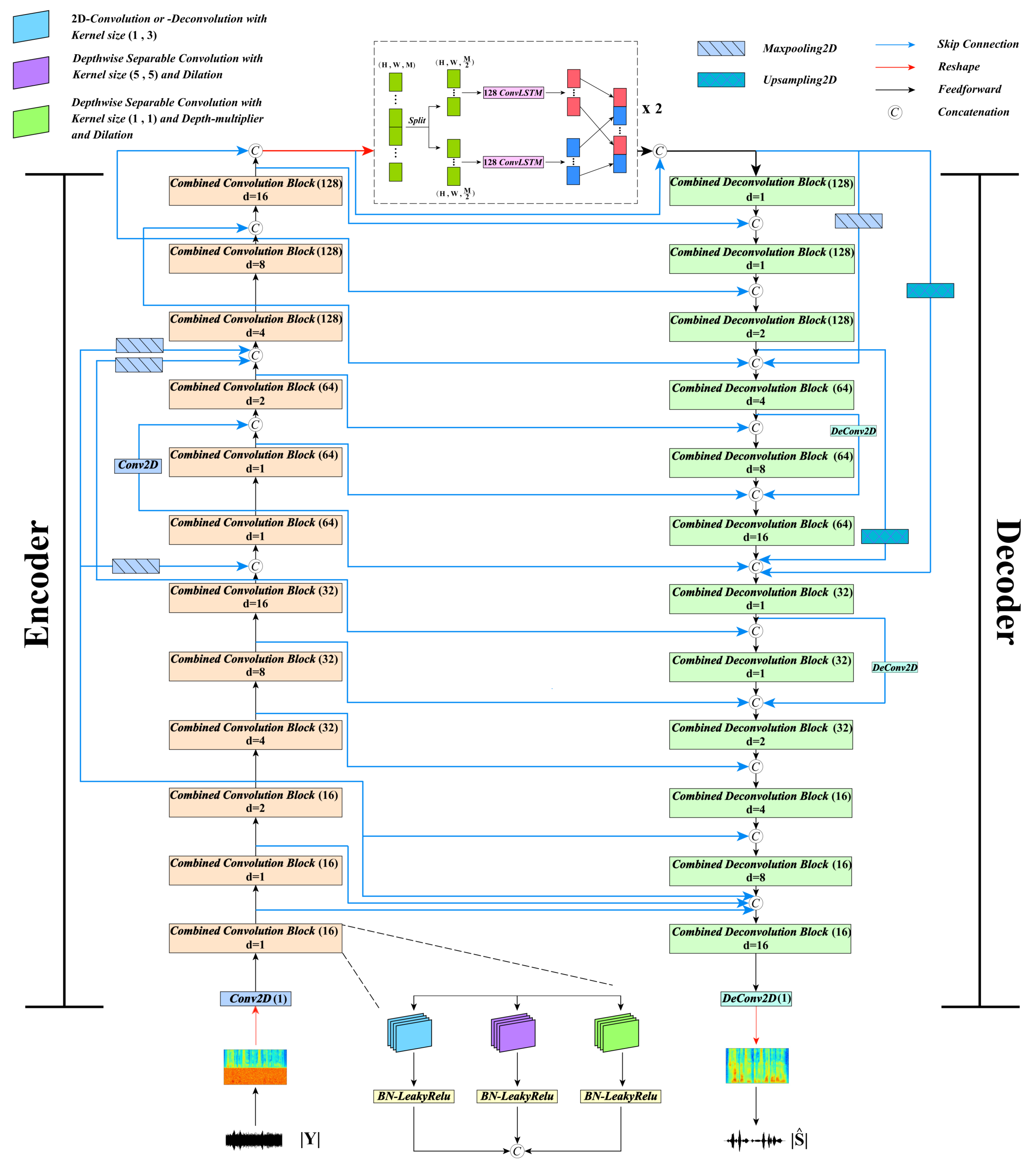 The standard 2D deconvolution utilizes strides to upsample the information flow. Batch Normalization and LeakyReLU are followed to improve training stability and nonlinearity. These operations are also used to process the outputs of two separable convolutions. Moreover, the upsampling is employed to expand the spatial dimensions of two separable convolutions when needed, which enhances the model’s ability to capture fine details. Finally, the processed outputs of all three convolutions are concatenated to provide an informative representation of speech signals.