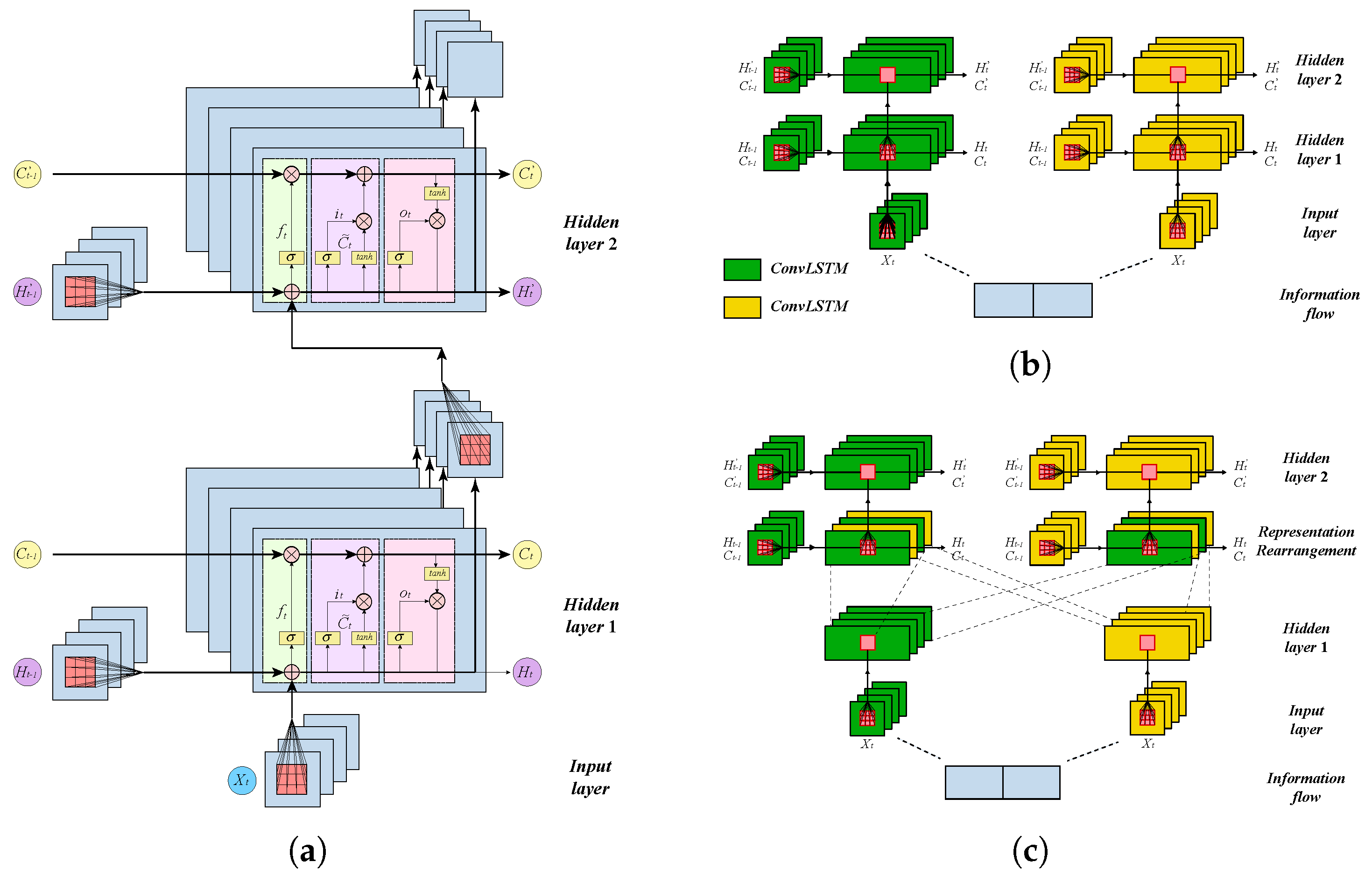 Figure 5. The architecture diagram of the proposed Grouped ConvLSTM. (a) A standard ConvLSTM. (b) A Grouped ConvLSTM without representation rearrangement. (c) A Grouped ConvLSTM with representation rearrangement.