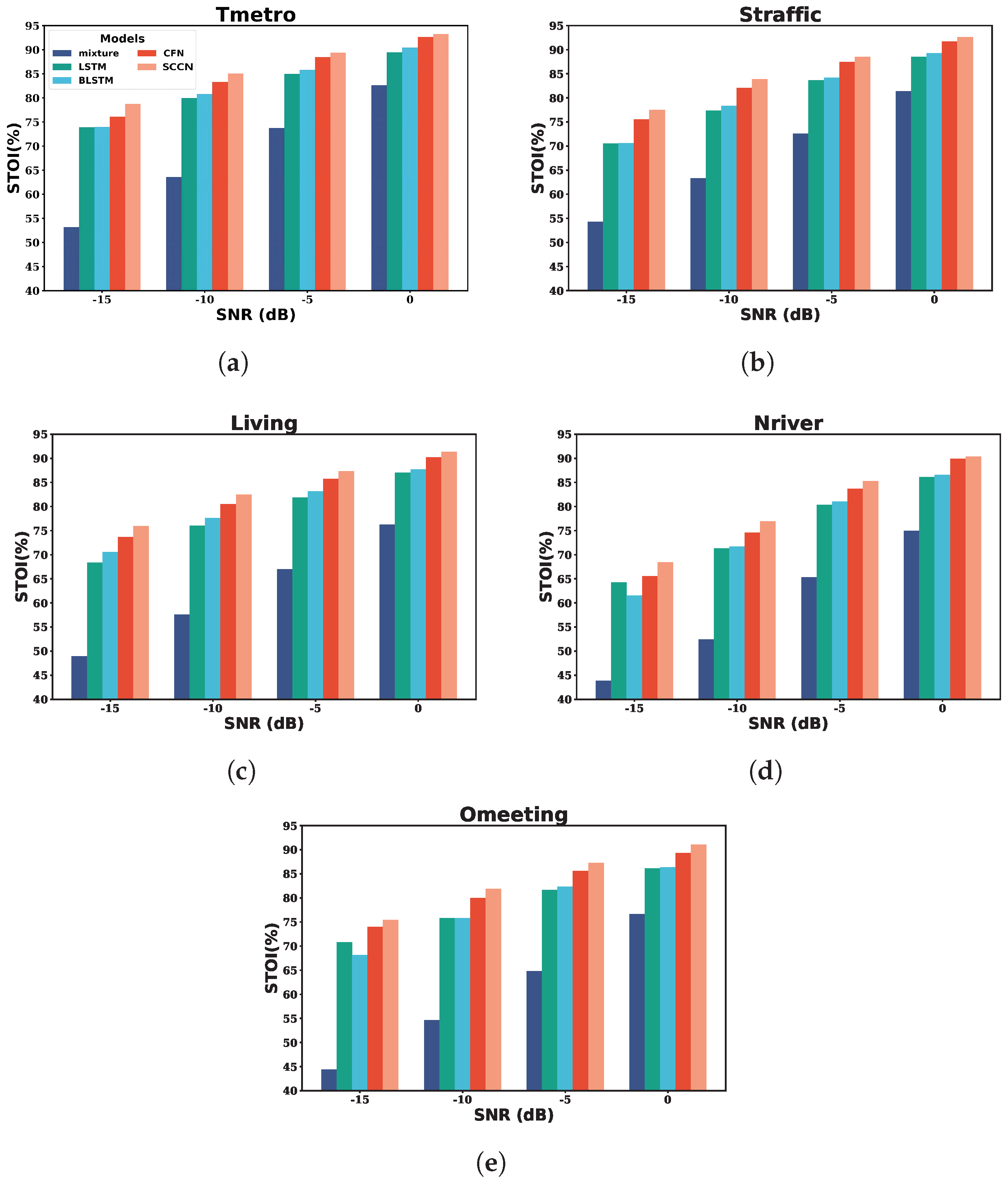Figure 6. STOI scores for different speech enhancement models on the Tmetro, Straffic, Living, Nriver, and Omeeting noises, with subplots (ae) corresponding to each noise.