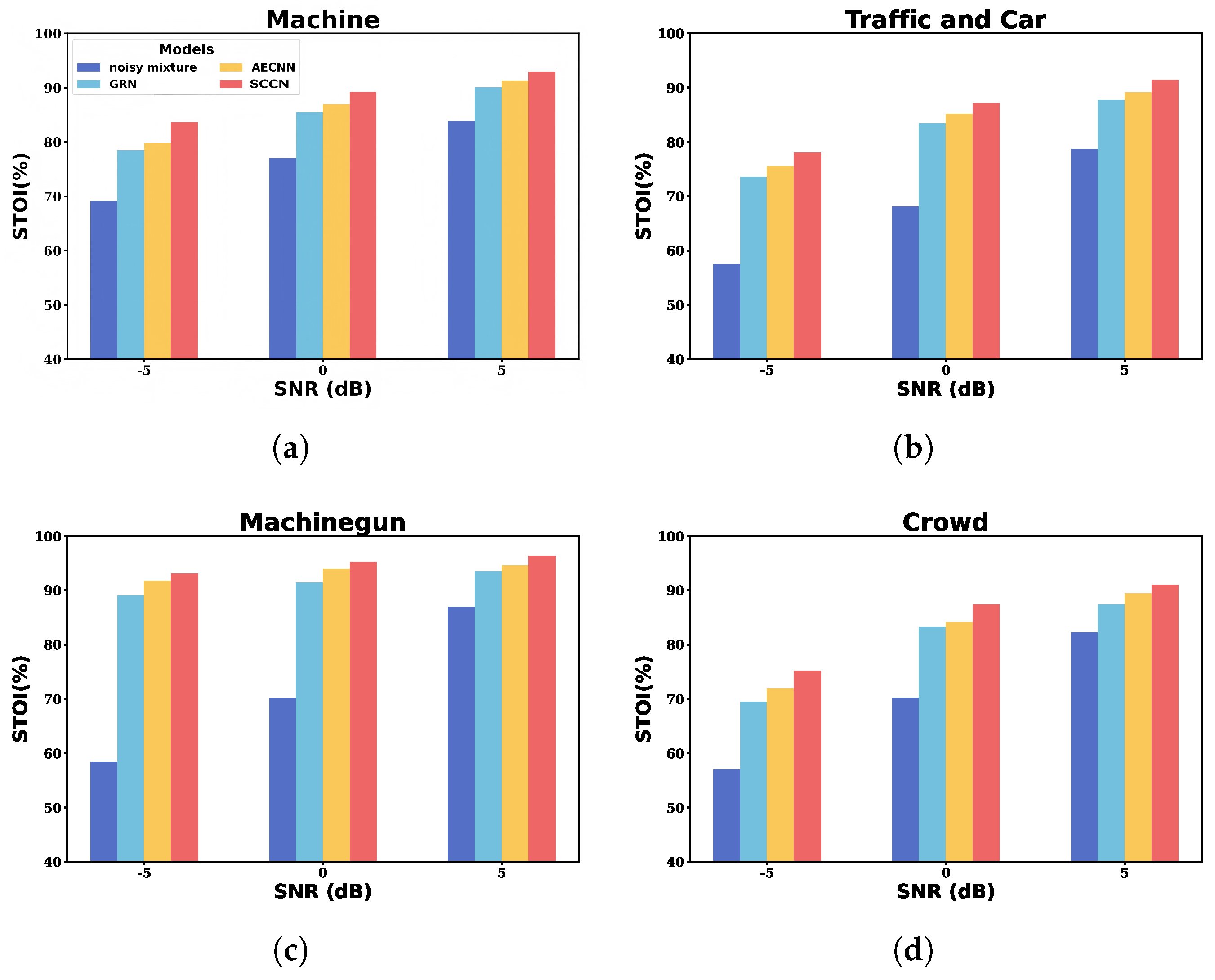 Figure 8. STOI scores for different speech enhancement models on the Machine, Traffic and Car, Machinegun, and Crowd noises, with subplots (ad) corresponding to each noise.