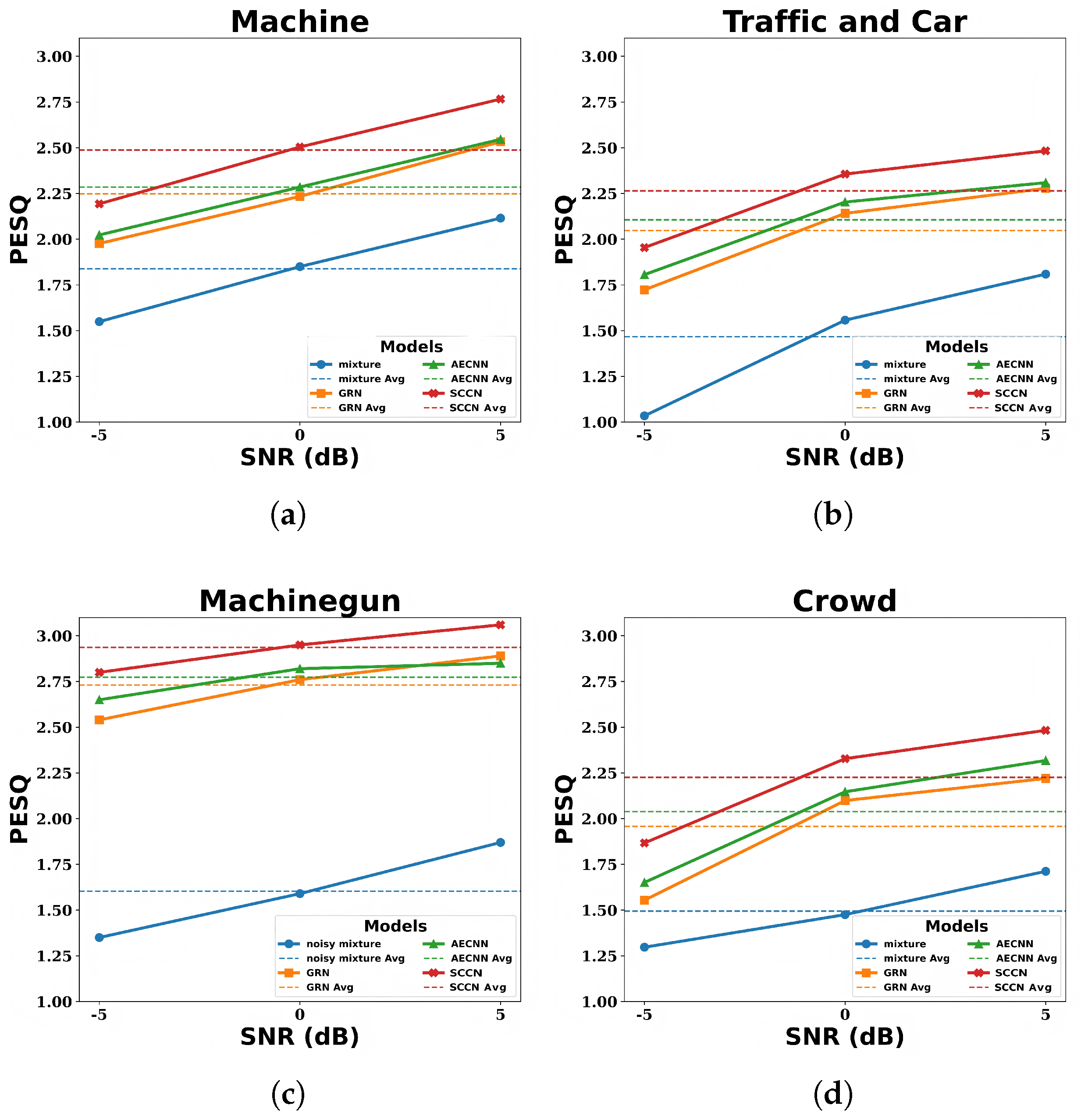 Figure 9. PESQ scores for different speech enhancement models on the Machine, Traffic and Car, Machinegun, and Crowd noises, with subplots (ad) corresponding to each noise.