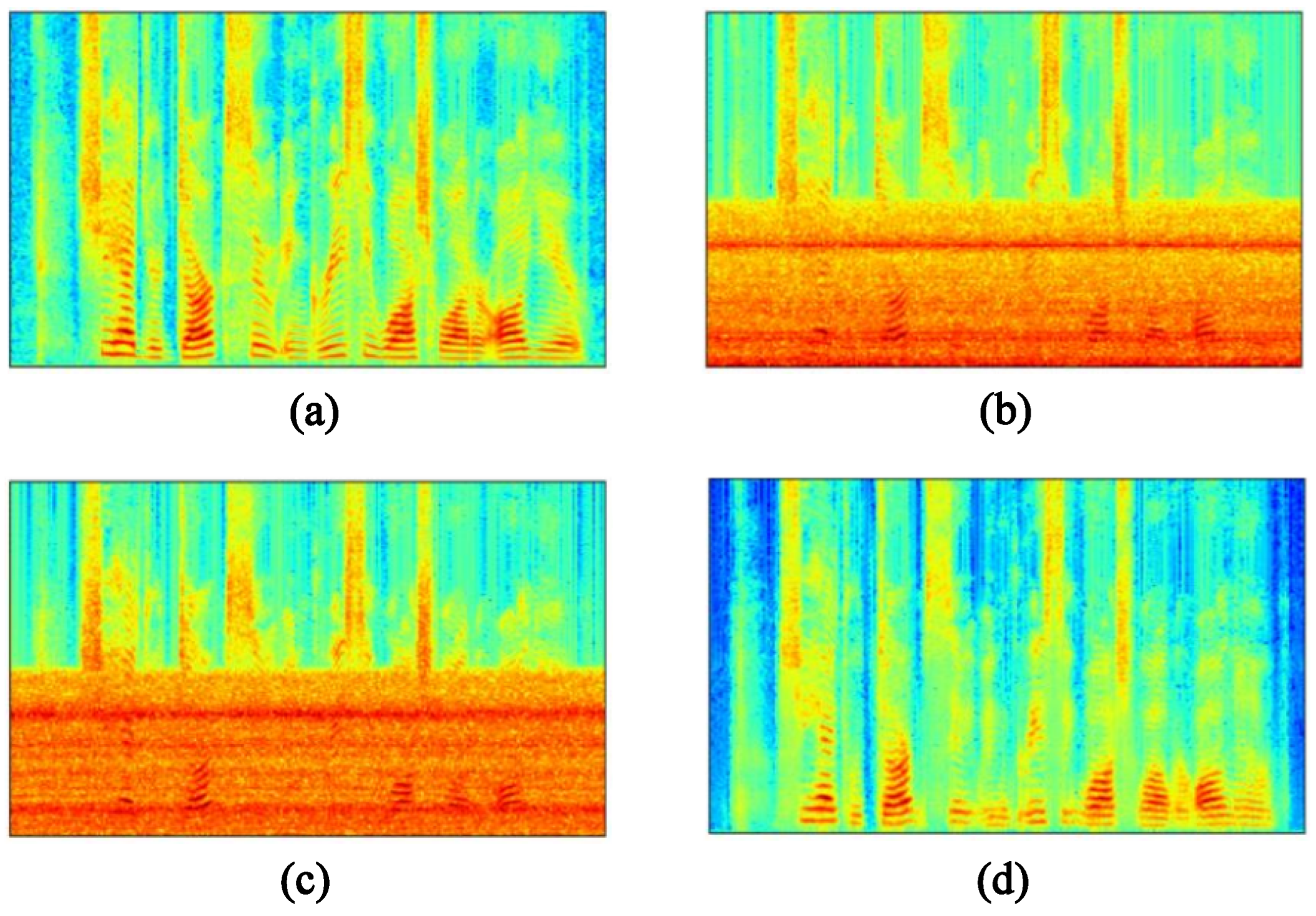 Figure 10. Spectra of clean speech, noisy mixtures, single-channel recorded noisy mixtures, and enhanced speech with F16 noise, with subplots (ad) corresponding to each.
