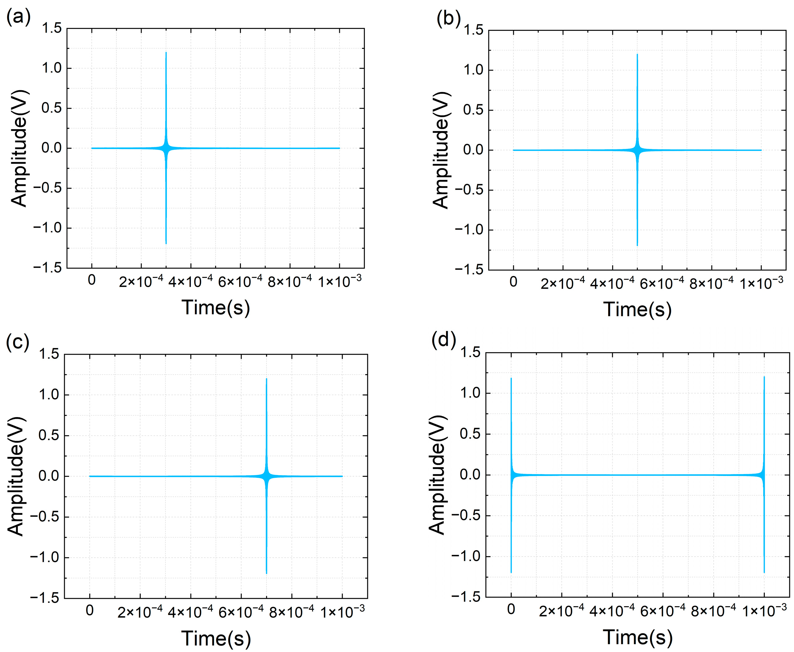 - Efficient centroid algorithm: The efficient centroid algorithm calculates the centroid of the effective signal envelope to locate the time information in the dual comb interference pulse signal, and obtains the time difference necessary for dual comb time synchronization by calculating the time interval between the centroids of the two interference pulses in the time domain.
