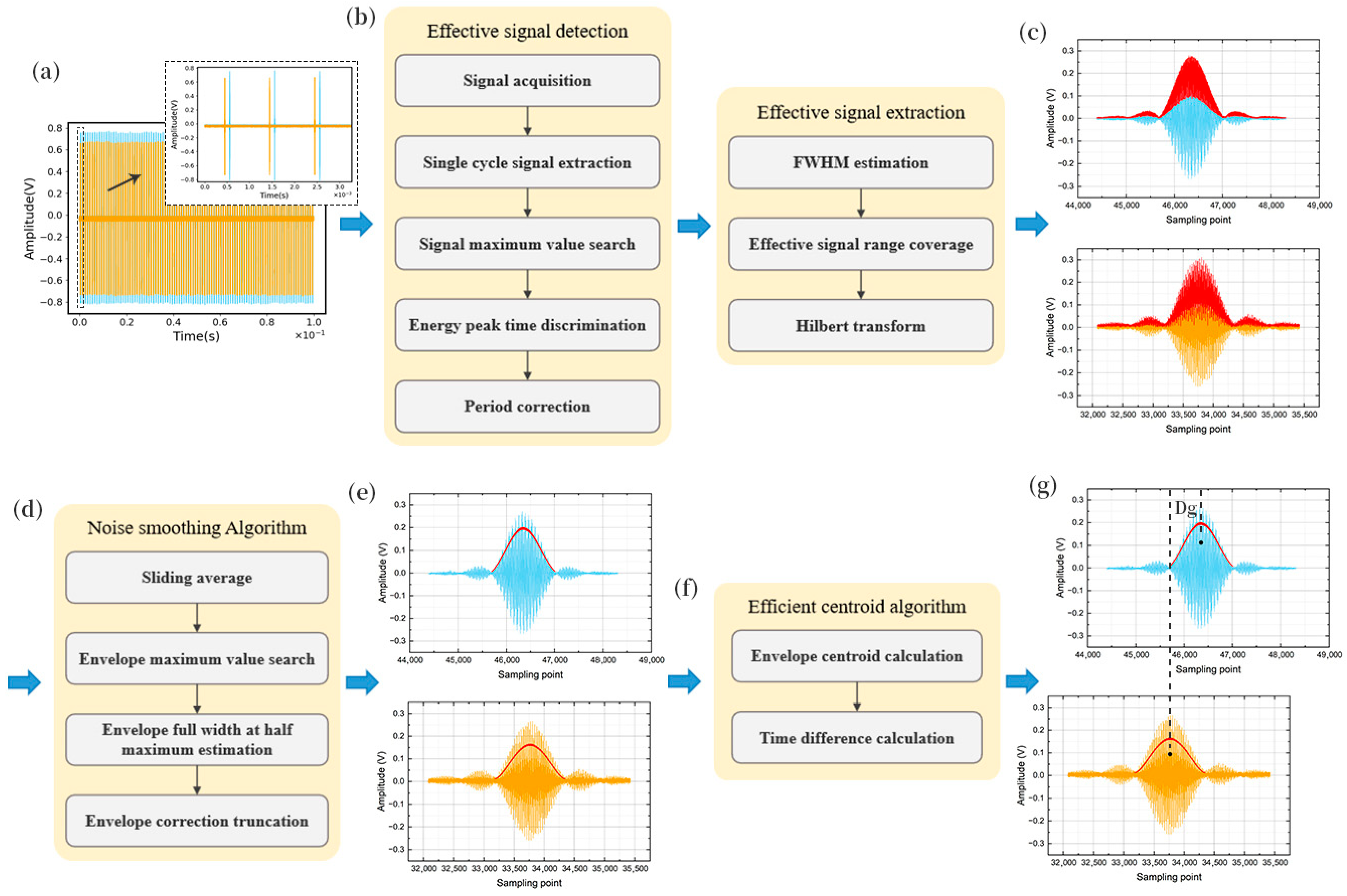 - Noise smoothing algorithm: The noise smoothing algorithm uses sliding average filtering on the envelope of the effective signal to reduce the impact of amplitude noise on the signal envelope waveform. Additionally, it utilizes feature points of the envelope signal that are less sensitive to noise, thereby minimizing the additional impact of amplitude noise on the centroid position;