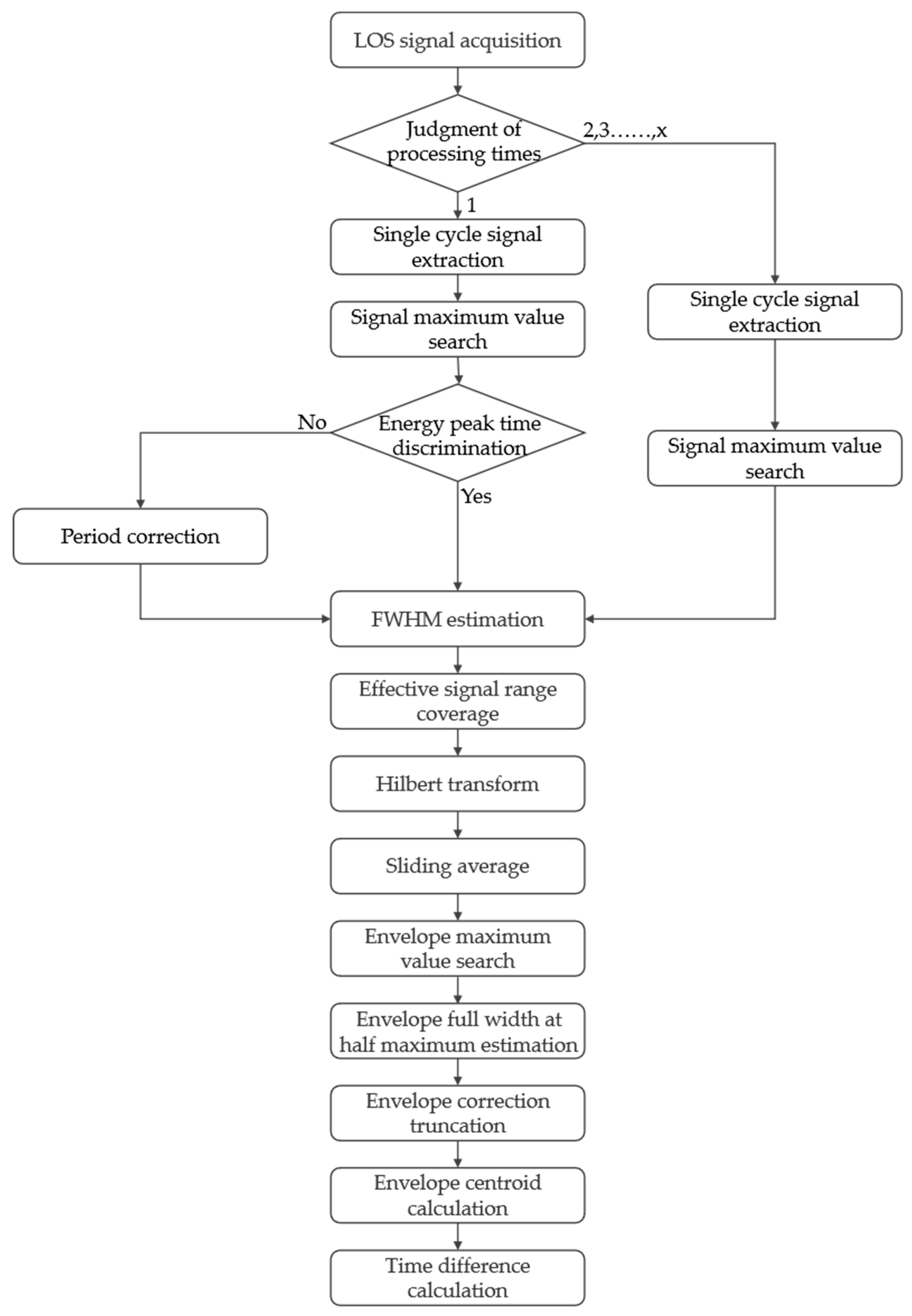 - Effective signal detection and extraction algorithm: The effective signal detection and extraction algorithm searches for the peak position of the signal as the starting point, takes the full width at half maximum (FWHM) of the main pulse of the dual comb interference pulse signal as the extraction unit to discard the ineffective energy that does not contribute to the time estimation results during the entire acquisition process, allowing for the extraction of the effective signal necessary for accurate time estimation;