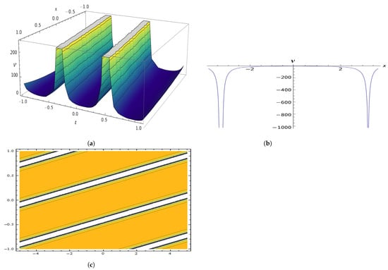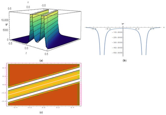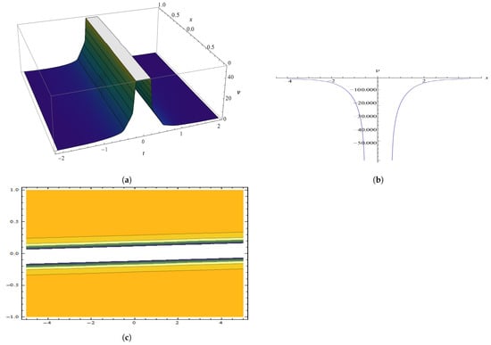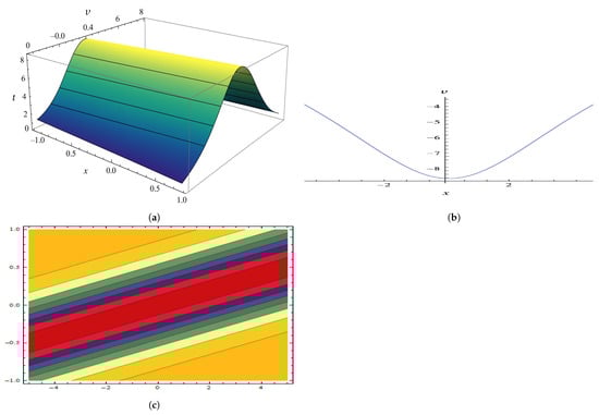The parameters , , , , and yield a graphic illustration of in Equation (26), where (a) displays a 3D graph, (b) displays a 2D plot, and (c) displays a contour illustration.