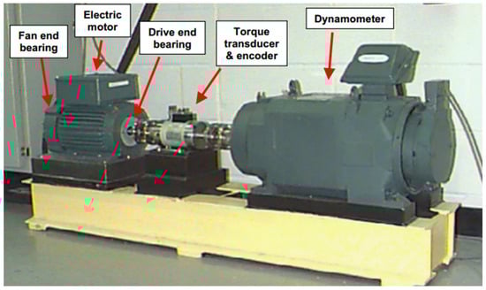 This research makes use of the bearing dataset provided by Case Western Reserve University (CWRU), which includes signals corresponding to a healthy bearing condition and three distinct fault types: inner race fault, outer race fault, and rolling element fault. Degradation mechanisms such as wear, corrosion, and fracture can lead to different bearing fault states. The experimental setup used for acquiring vibration signals under operational conditions is depicted in Figure 1. The public download link (https://engineering.case.edu/bearingdatacenter) (accessed on 23 September 2025). is now included to facilitate reproducibility for other researchers.