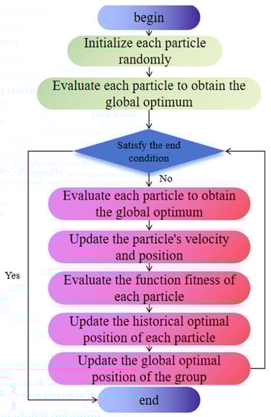 Particle Swarm Optimization (PSO) is a heuristic optimization algorithm inspired by the collaborative and information-sharing behavior of birds when searching for food. It finds the optimal solution by continuously updating and optimizing the positions of particles through iterative processes. PSO has been widely applied in areas such as signal processing and vibration analysis. By employing the PSO algorithm to adaptively optimize the VMD parameters [K,α], the influence of human intervention can be minimized. The basic process of PSO is illustrated in Figure 2.