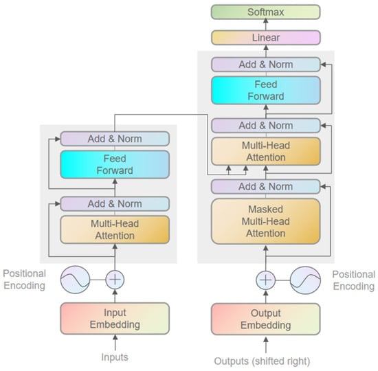 The Transformer module adopts an encoder-decoder architecture (Figure 5). The encoder transforms the input sequence into a contextual representation, while the decoder generates the output sequence based on the context provided by the encoder. By introducing a multi-head self-attention mechanism, the Transformer replaces the traditional recurrent neural network (RNN) structure, enabling efficient parallel computation.