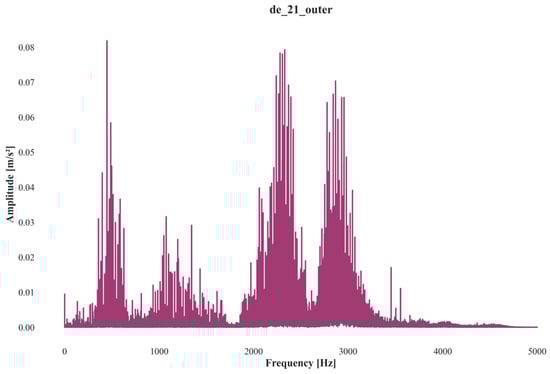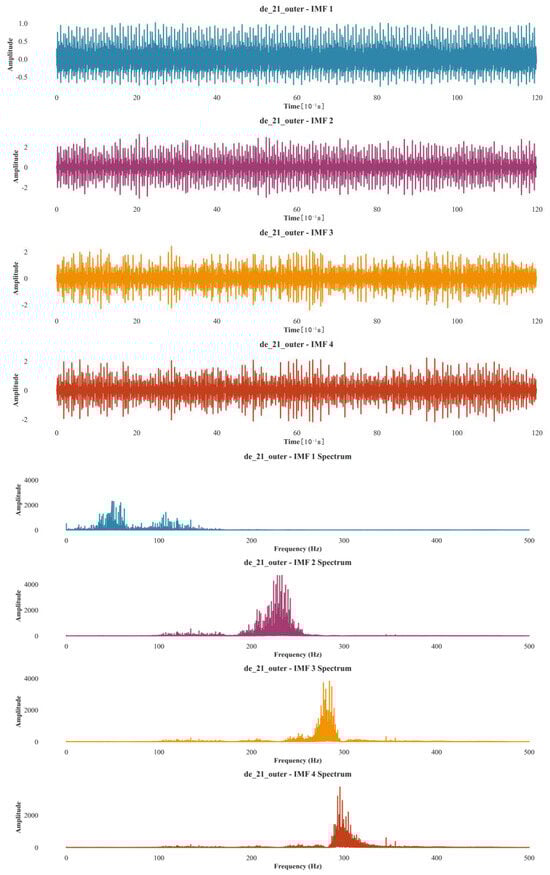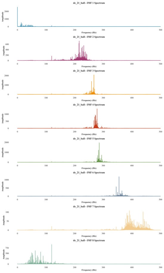 The spectrum of the modal components obtained after signal decomposition using the VMD method showed that the modal components are concentrated around their respective center frequencies, effectively reducing the modal aliasing phenomenon. However, due to the manual selection of the K value and penalty factor α, some modal aliasing still persists. Specifically, aliasing was observed in the modal components IMF = 3, IMF = 4, and IMF = 5, with frequencies ranging between 200–300 Hz and amplitudes between 0–1000. As shown in Figure 15. Despite the reduction in aliasing compared to EMD, the optimization of these parameters remains crucial to further mitigate the aliasing effect.