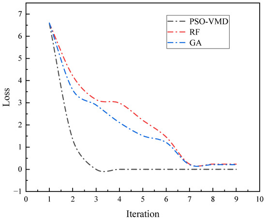 The PSO algorithm converged by the third iteration, achieving near-zero loss and outperforming the other two algorithms (Figure 13). The Random Forest (RF) algorithm, which relies on ensemble learning for feature selection and classification, does not perform as well in parameter optimization. Additionally, the Genetic Algorithm (GA) converges slowly, making it less efficient in this task. In conclusion, the PSO algorithm demonstrates superior optimization performance for this task, providing faster convergence and better classification accuracy. To further verify the effectiveness of the PSO-based signal decomposition, we compared PSO-VMD with the traditional FFT method. By analyzing the spectral clarity and modal separation results, as well as statistical indicators such as energy concentration and kurtosis, we demonstrated that PSO-VMD can more effectively isolate informative signal components, which significantly enhances the downstream feature extraction and classification performance.