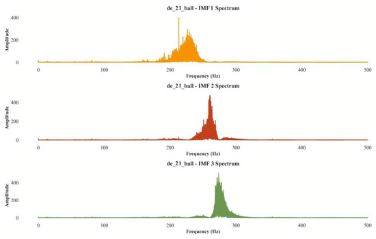 To further verify the effectiveness of PSO-VMD feature extraction, the rolling element (De_21_ball) fault was used as an example. The bearing vibration signal was decomposed using EMD, VMD, and PSO-VMD methods. After EMD decomposition, the energy was predominantly concentrated in the first few components, so the first three modal components were selected for analysis. The spectrum of the modal components obtained after EMD decomposition reveals significant modal aliasing between 200 Hz and 300 Hz, as shown in Figure 14. This modal aliasing can obscure the fault characteristics, making it difficult to distinguish between different modes and accurately identify the fault. It should be noted that the initial loss value may appear slightly below zero due to the inclusion of bias initialization and L2 regularization terms, which do not affect the non-negativity of the primary loss function (e.g., cross-entropy).