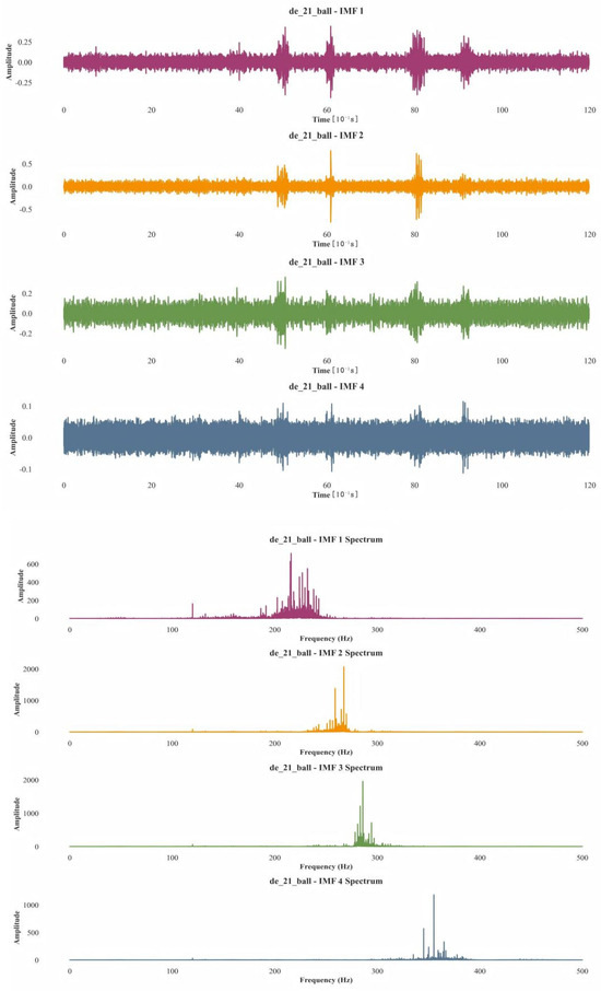 The optimal parameter combination obtained through PSO optimization of VMD was [4, 1248]. This parameter combination was applied to VMD to decompose the post-fault vibration signal within the time range of 0 to 1.2 s. The decomposition resulted in four Intrinsic Mode Function (IMF) components, each with its corresponding spectrum diagram. Unlike other methods, the PSO-VMD decomposition method does not exhibit frequency aliasing, ensuring that the spectral components remain distinct and non-interfering. By optimizing the parameters, PSO-VMD achieves a reasonable decomposition of the original signal, effectively separating different modal components. This method demonstrates excellent adaptability in fault signal processing. Each IMF component exhibits a clear and well-defined spectral distribution in the frequency domain, facilitating more accurate feature extraction and fault diagnosis. which leads to more accurate feature extraction and diagnosis of faults. Results are shown in Figure 16.