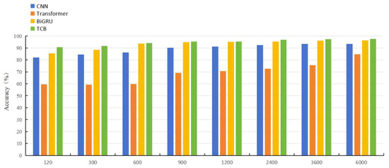 With the increase in training sample size, the accuracy of all models showed a steady improvement before reaching a plateau. Specifically, for the Transformer model, when the number of training samples was below 1200, its accuracy reaches a maximum of 69.16%. However, when the number of training samples reaches 6000, the accuracy increases to 84.82%. These results suggest that the Transformer model required a large amount of data to perform well and struggles to capturing local, subtle information effectively. The CNN model, on the other hand, achieves an accuracy greater than 90% with smaller sample sizes (fewer than 1200 samples), and stabilizes at an accuracy of 93.4% with 3600 samples. This indicates that CNN has high computational efficiency and can perform well with smaller datasets, but its ability to process more complex signals was limited compared to the other models. The BiGRU model demonstrates the highest accuracy among the single models across eight training scenarios with varying sample sizes, as shown in Figure 17. However, since BiGRU considers both forward and backward time information, and calculates the state of each time step iteratively, it was computationally slower than the CNN and Transformer models. The longest running time recorded for BiGRU was 101.7 s, as shown in Table 7. In summary, while the Transformer model requires more data to achieve higher accuracy, CNN was efficient for smaller datasets but may struggle with complex signals. BiGRU outperforms both models in accuracy but at the cost of longer training times.