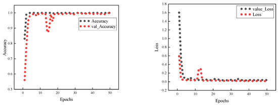 By combining CNN, BiGRU, and Transformer, a complementary structure was formed that integrates local feature extraction, short time series modeling, and global information modeling. This combined model achieves an accuracy of over 97% in the ablation experiment. In the test with 6000 training samples, the proposed model achieves the best performance in terms of both time and test accuracy, as shown in Table 7. Furthermore, the original data was fed into the model after PSO-VMD feature extraction. After 18 iterations of training (where one epoch refers to a complete forward and backward pass through the entire training dataset), the model reaches stability and gradually converges, with the loss value approaching 0. As shown in Figure 18, the model reaches an accuracy of 98.9%. as shown in Figure 18. The results demonstrate that the model structure and feature extraction method proposed in this paper significantly enhance the performance of fault diagnosis, effectively enhancing both the accuracy and efficiency of the system.