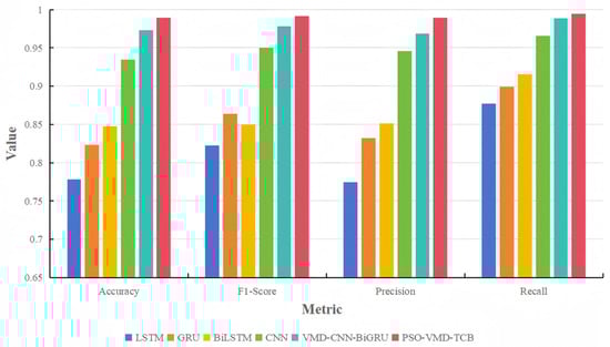 In order to further verify the comprehensive performance of this model, the dataset processed by PSO-VMD was used to compare the performance of five deep learning models, CNN, LSTM, BiLSTM, GRU, VMD-CNN-BiGRU and the VMD-TCB model proposed herein. The comparison considers metrics such as accuracy. precision, recall, and F1 score during the training process, as shown in Figure 19.