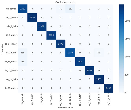 To assess the errors in the experimental results of the PSO-VMD-TCB model, this paper presents a confusion matrix and t-SNE visualization. The diagonal elements of the confusion matrix correspond to the number of correctly classified samples, while the off-diagonal elements represent misclassified samples. These values provided valuable insight into the model’s performance across different fault types and highlight areas of misclassification, as shown in Figure 20, For the 10-class task we additionally report macro averages derived from the confusion matrix: Macro-Precision/Recall/F1 = 0.9768/0.9765/0.9766. Additionally, the t-SNE visualization was used to differentiate fault types, with each fault type marked by a distinct color. This allows for identification of patterns and clusters within the feature space. By combining these analyses, a more comprehensive understanding of the model’s classification performance was achieved, demonstrating its effectiveness in distinguishing between various fault categories.