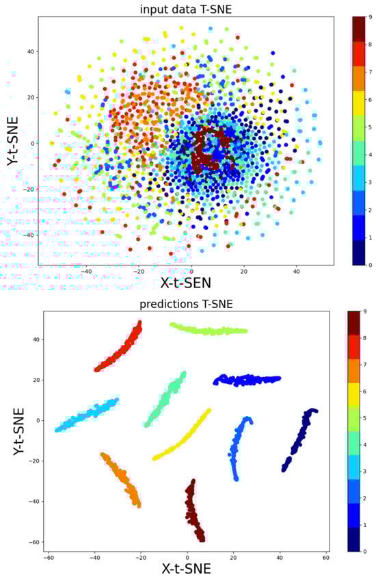 In literature [24], there remains a noticeable overlap between the real data (red) and the generated data (blue), and the features of different classifications were quite similar. This overlap makes it challenging to confidently distinguish between categories. In contrast, in this paper, the data points form distinct, well-separated clusters in the low-dimensional space. This clear separation enhances the discriminative ability of the model, significantly improving classification quality, as illustrated in Figure 21. The results highlight the superior effectiveness of the proposed method in distinguishing between fault types, demonstrating its improved performance relative to prior approaches.