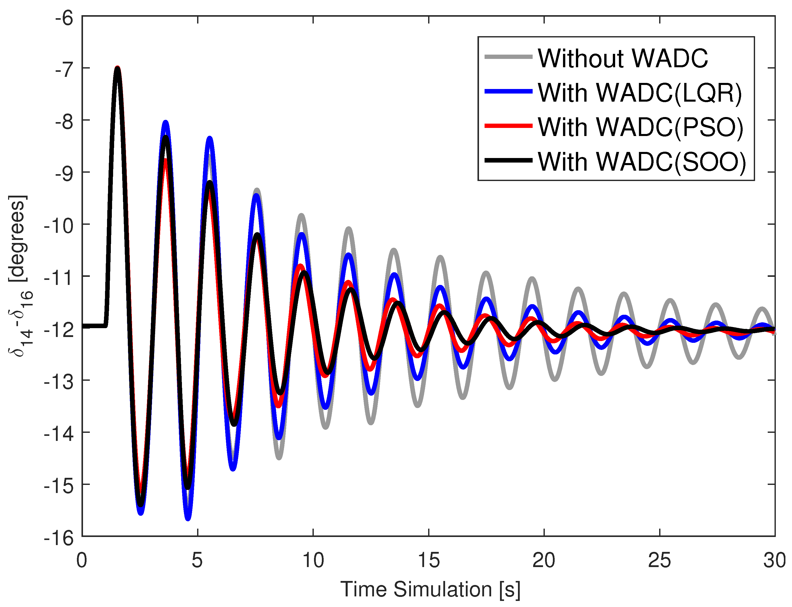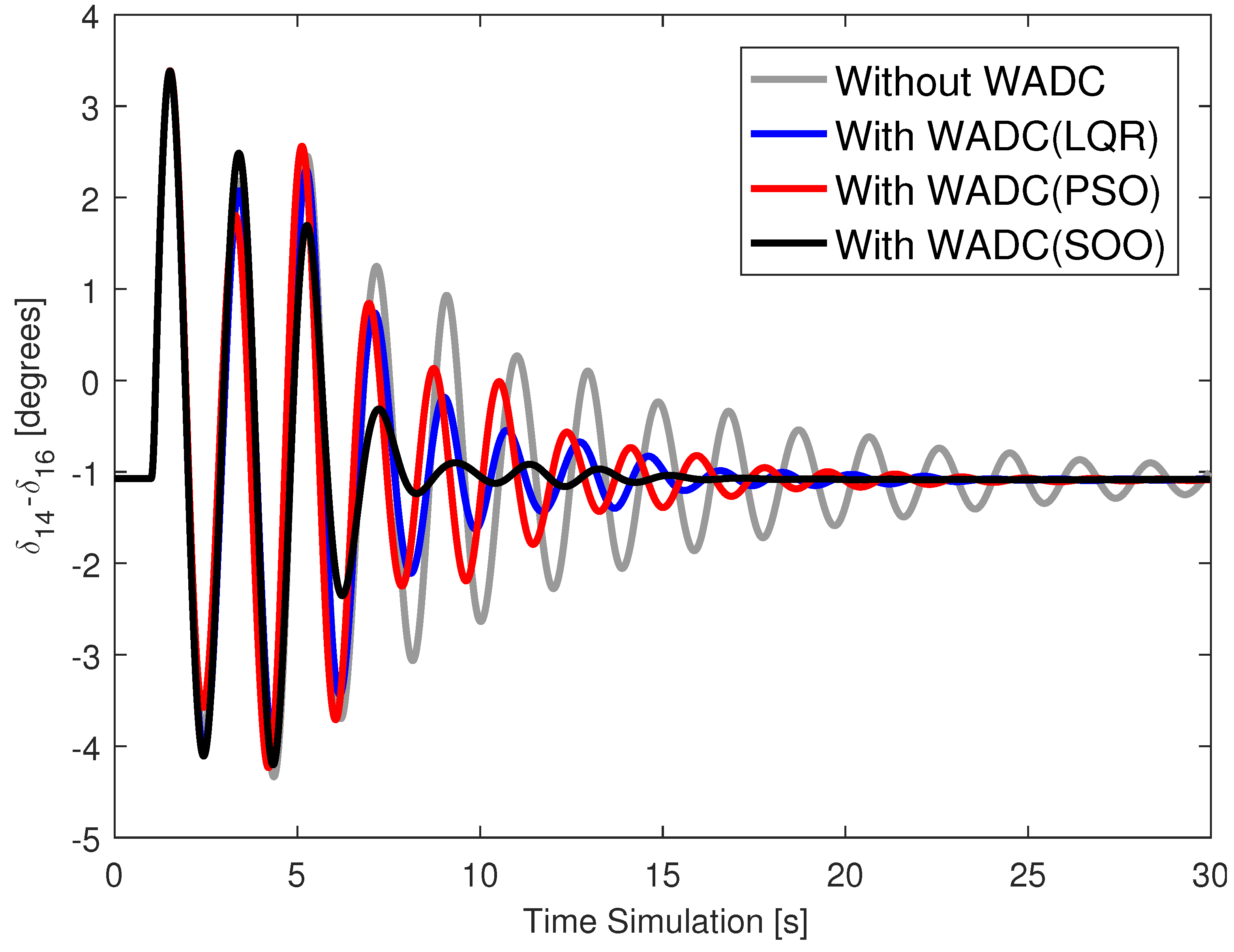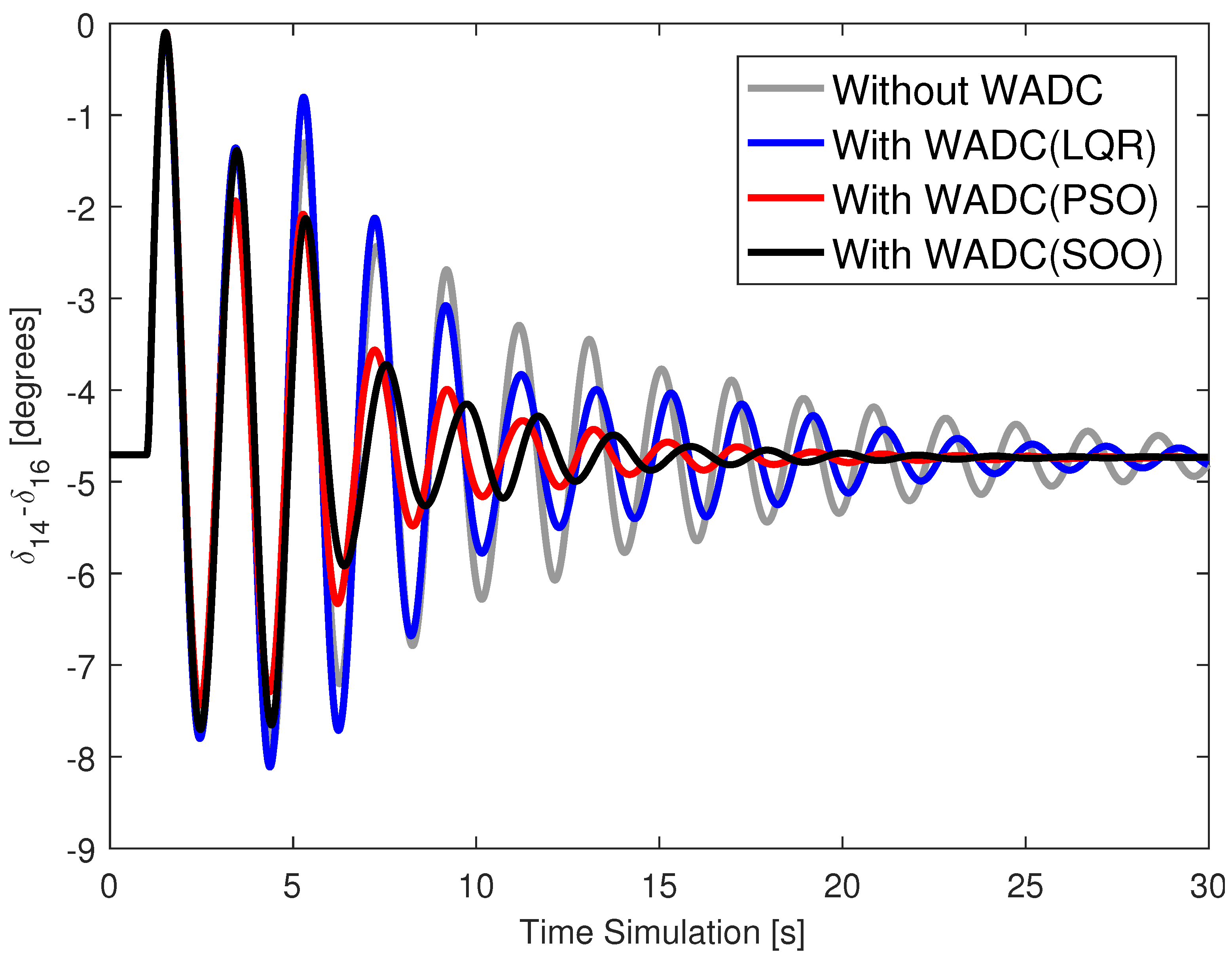 This paper presents the design of a WADC robust to communication failures through the solution of a multi-objective optimization model. Linearized power system models are employed. Constraints are incorporated into the optimization model, such as the requirement for the existence of a positive-definite symmetric matrix from an LMI formulation. Limiting the variables’ boundary values of the WADC has been shown to facilitate the obtainment of this positive-definite symmetric matrix. The stellar oscillation optimizer [57] and particle swarm optimization [58] metaheuristics are applied and compared in the multiobjective optimization model. In addition, modal and time domain analyses are presented to evaluate the benefits of the WADC in the operation of the power system. The main contributions of this article are as follows: