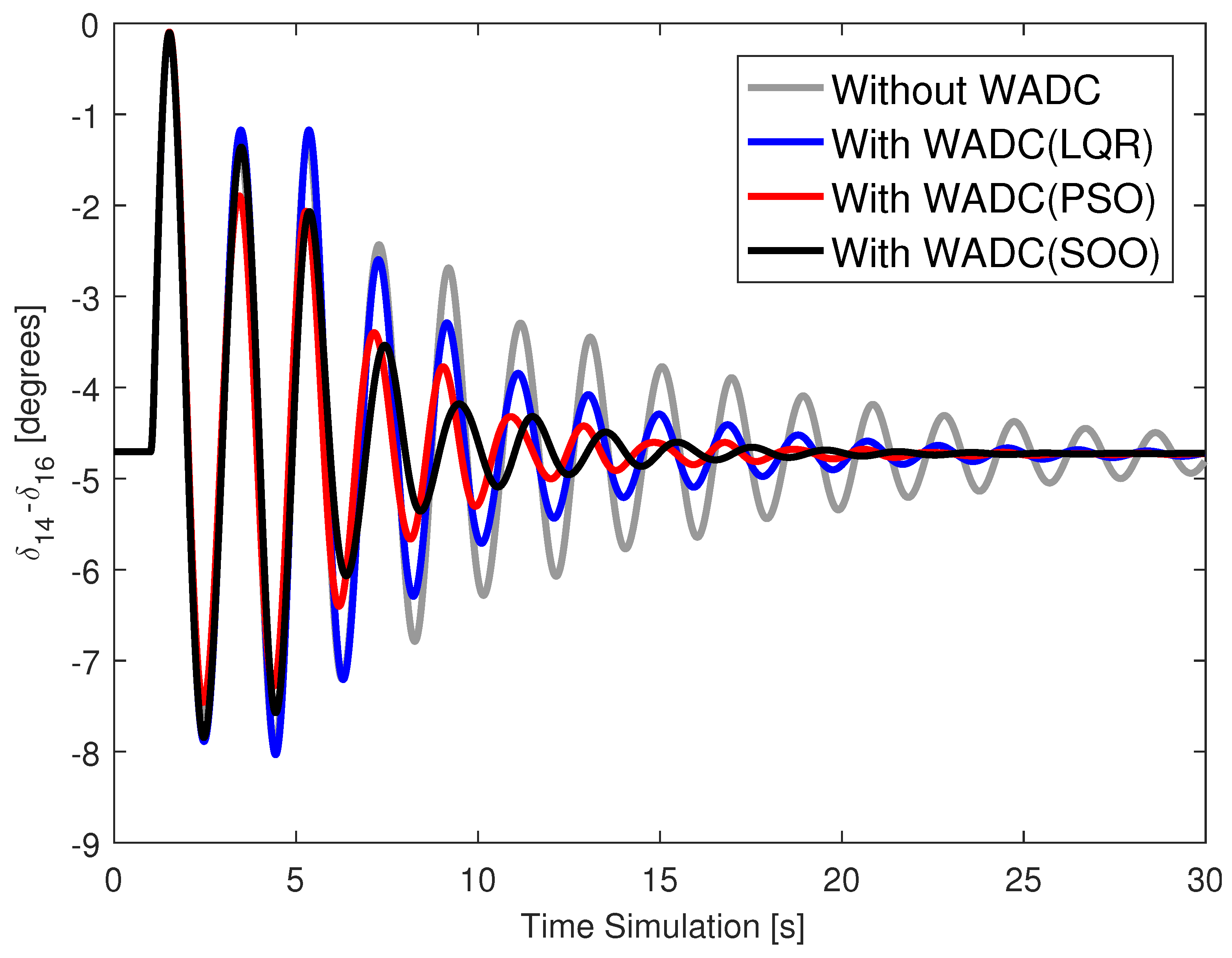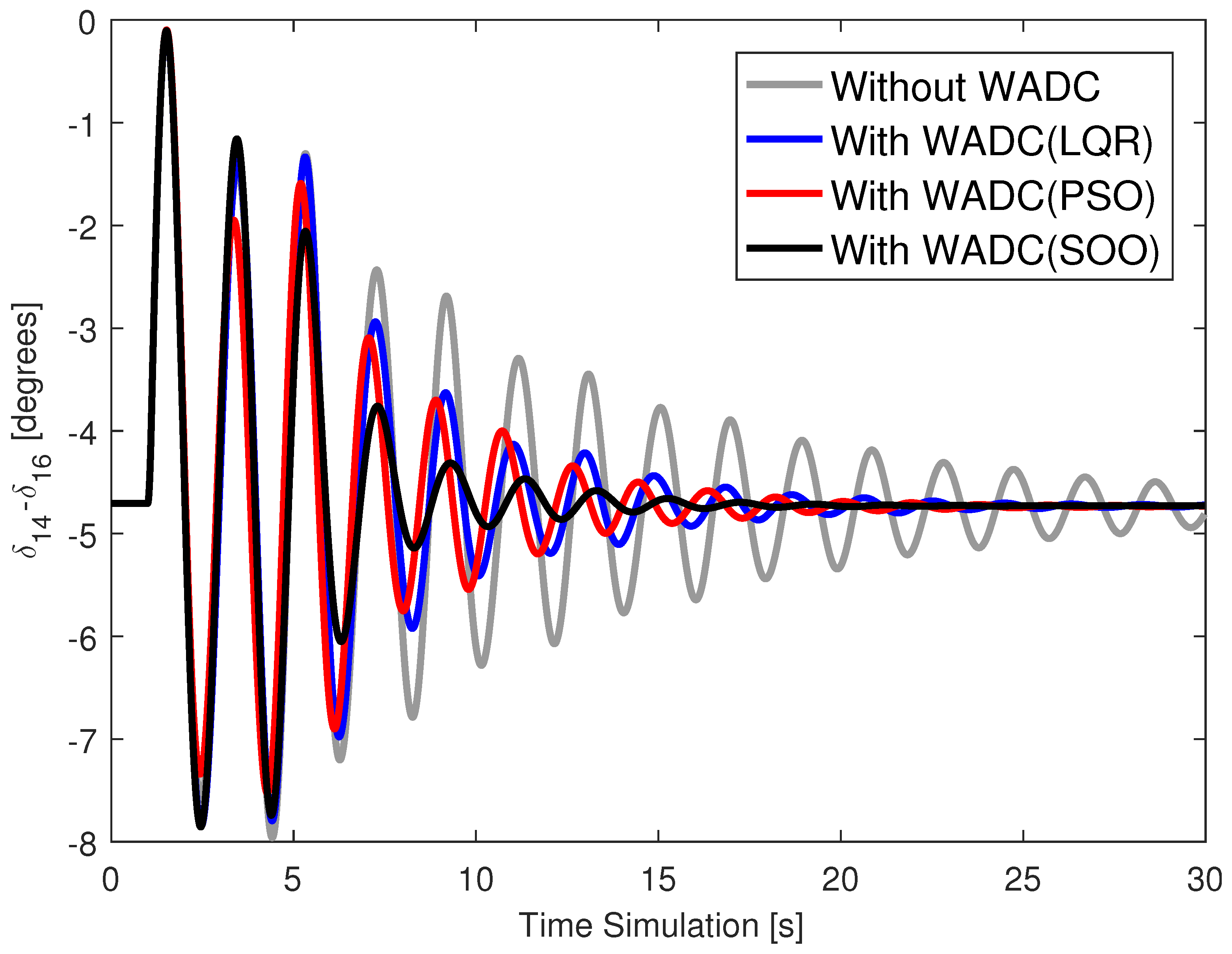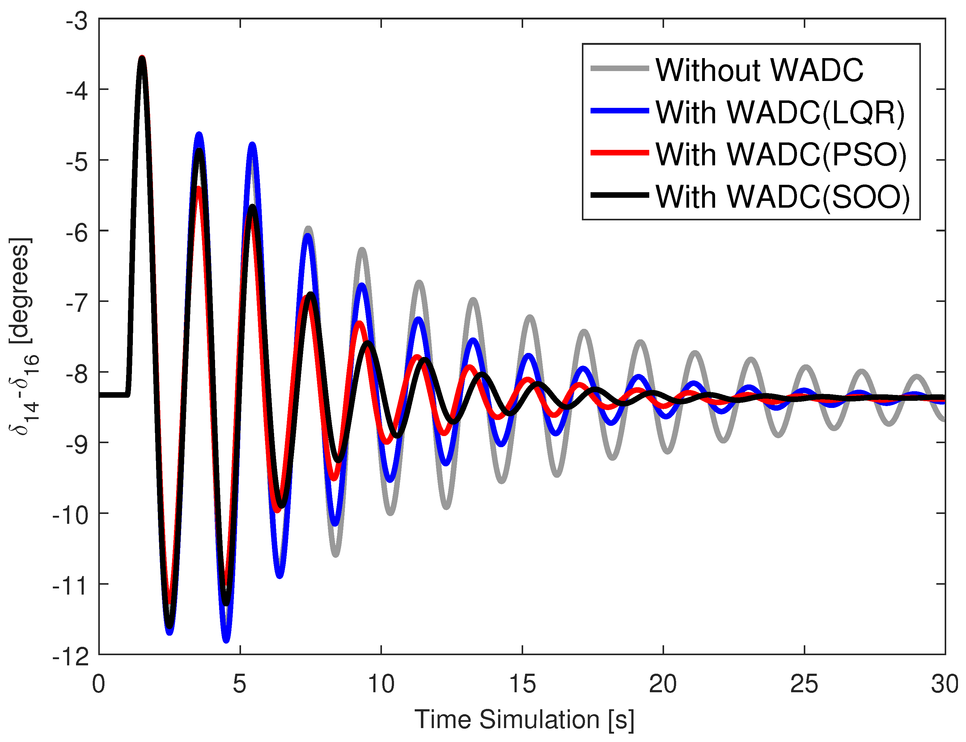 In LMI-based damping control designs, the search for a symmetric, positive-definite matrix ensures the stability of the dynamic system. Various LMI-based techniques are available in the literature for damping control design [55,56]. However, one of the difficulties reported by the authors is determining this symmetric, positive-definite matrix and meeting the system’s dynamic performance requirements.