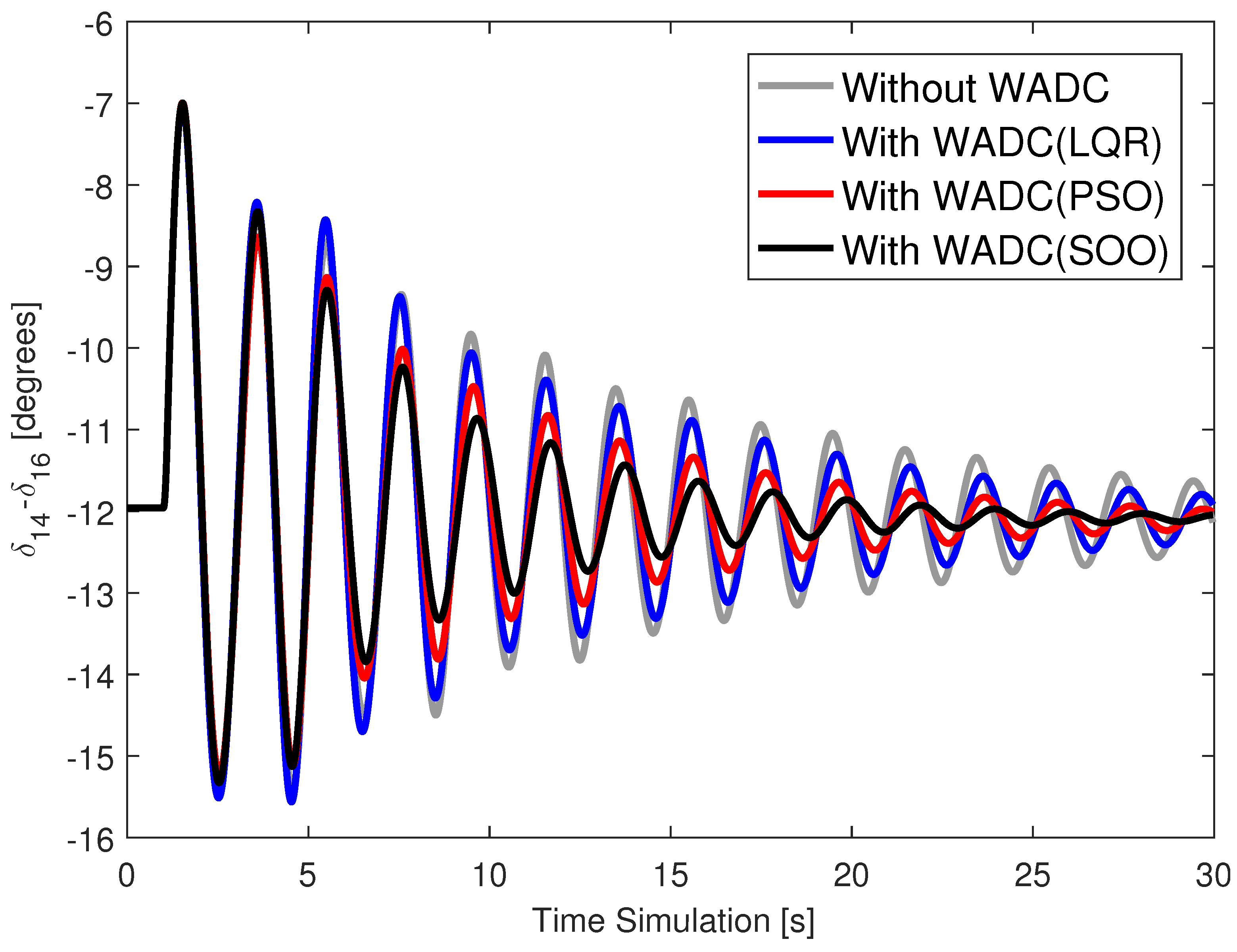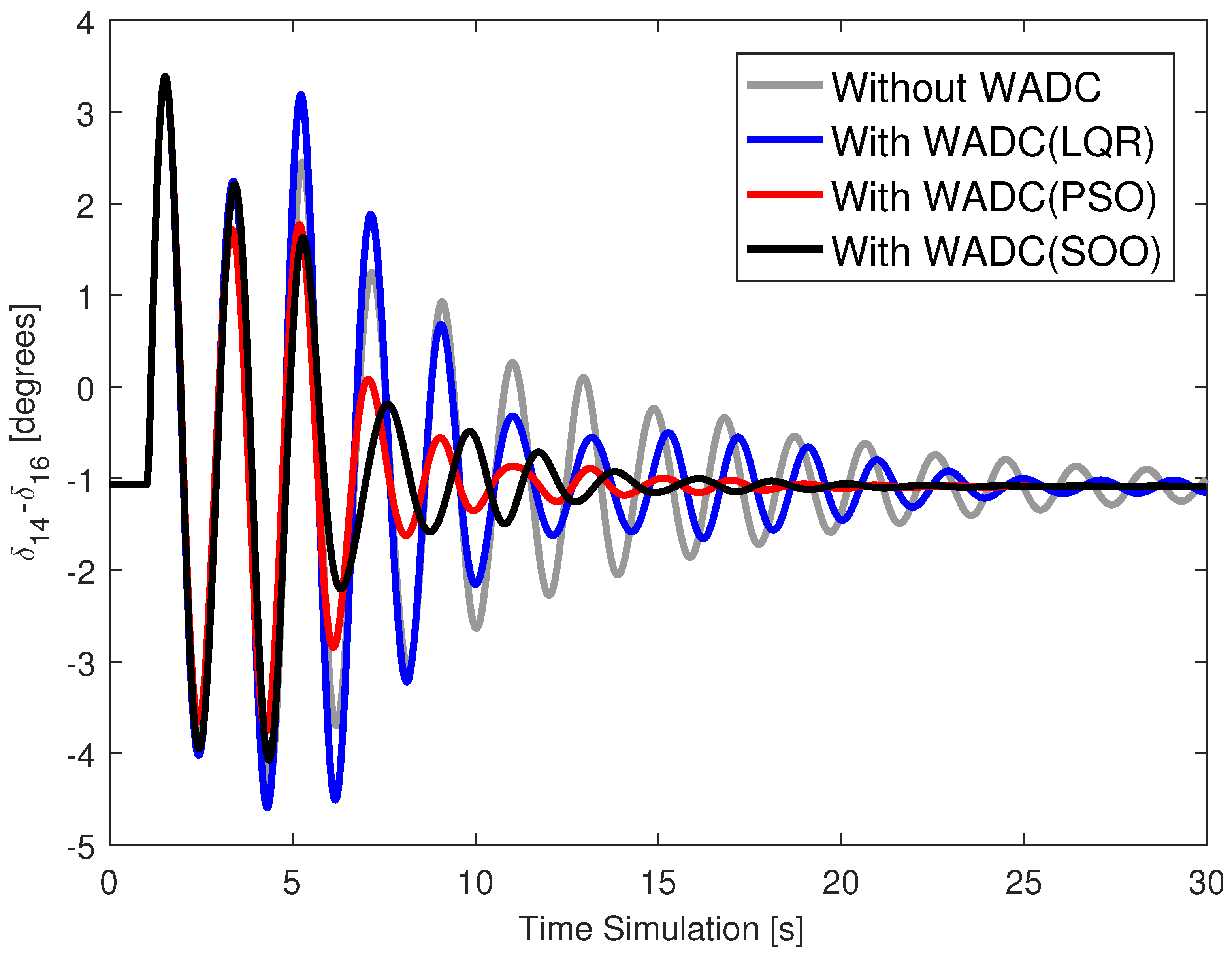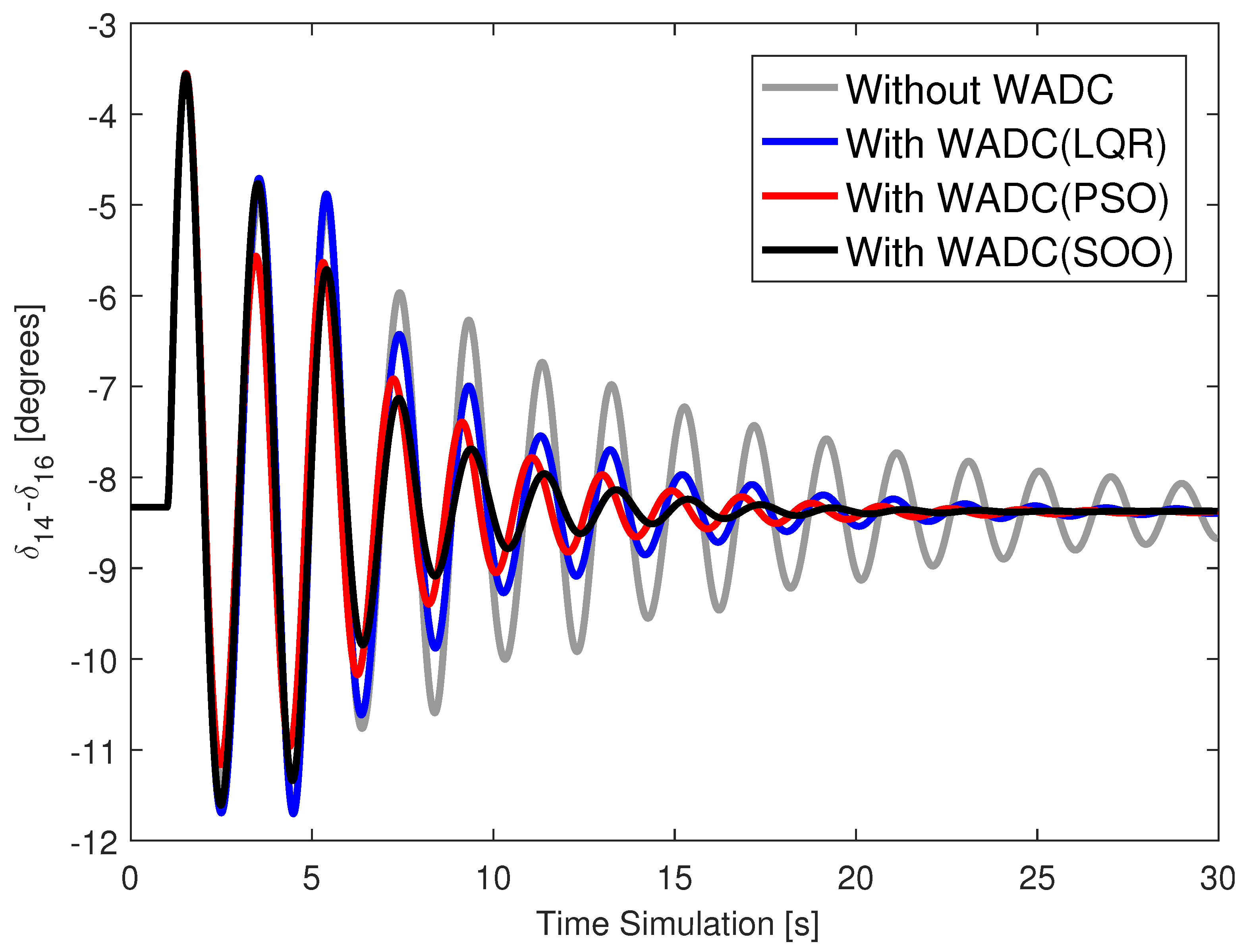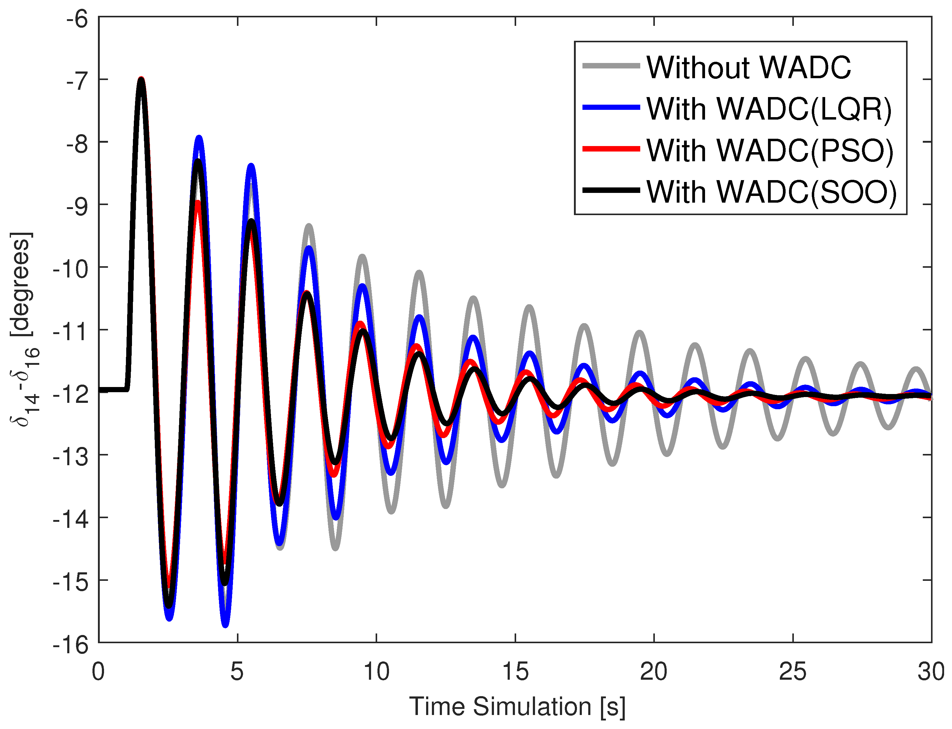 In LMI-based damping control designs, the search for a symmetric, positive-definite matrix ensures the stability of the dynamic system. Various LMI-based techniques are available in the literature for damping control design [55,56]. However, one of the difficulties reported by the authors is determining this symmetric, positive-definite matrix and meeting the system’s dynamic performance requirements.