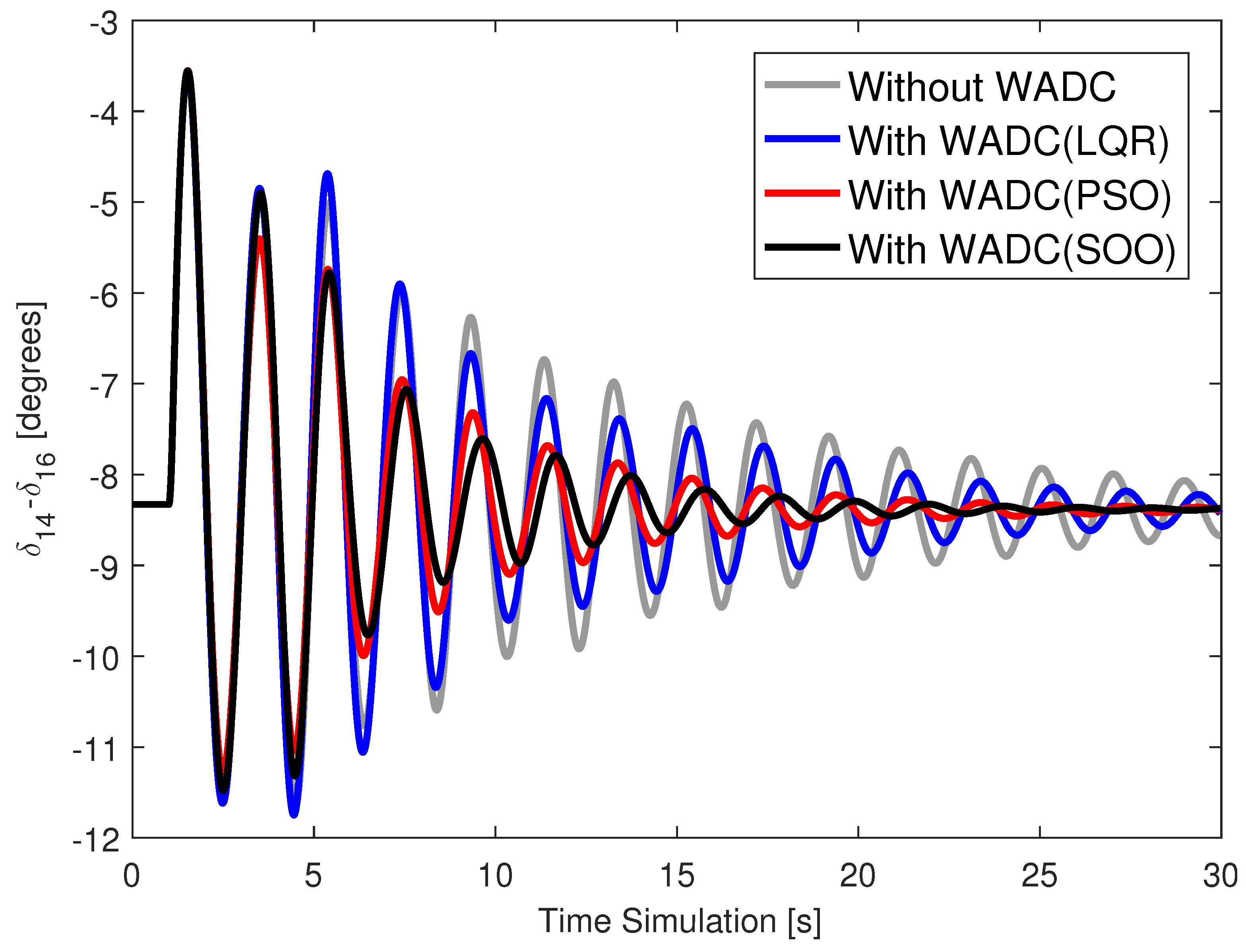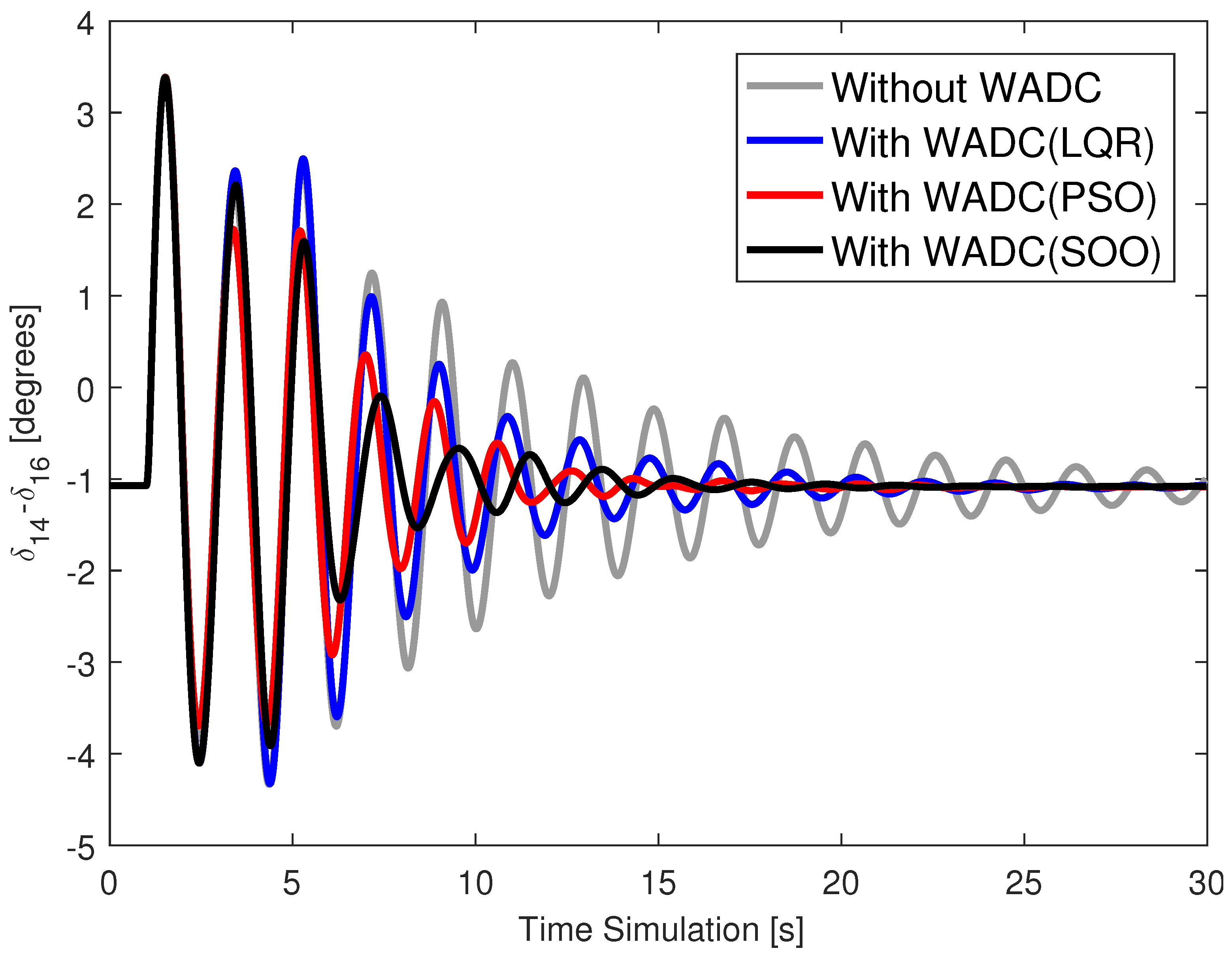 The benefits of PMUs have also extended to power system control due to improved observability and high data transmission rates. Researchers have developed wide-area damping controllers (WADCs), which utilize data from PMUs at different locations in the system and produce control signals for the AVRs [20]. Various techniques have been presented by the scientific community for the design of a WADC [21]. Zhang and Bose [17] presented a method based on LMIs. Bento [22] proposes an LQR-based technique for the design of a robust WADC. Mukherjee et al. [23] proposed the design of a WADC using reinforcement learning. Gupta et al. [24] proposed using reinforcement learning and deep neural networks to design a WADC. Ranjbar et al. [25] developed a method using Thevenin impedance and the CART technique for the design of a WADC. Metaheuristics such as PSO [26,27], greylag goose optimization [28], firefly algorithm [29], genetic algorithm [30,31], grey wolf optimizer [32], mountain gazelle optimizer [33], African vultures optimization [34], marine predators algorithm [35], and crow search algorithm [36] are also widely used in the design of this controller. Researchers have shown that WADCs can significantly increase the damping ratios of inter-area oscillation modes. Thus, the combined use of PSSs and a WADC can improve system performance requirements in small-signal stability studies. Furthermore, a well-defined optimization model can be solved by any metaheuristic.