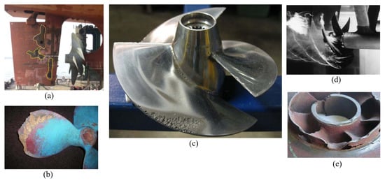 Destructive effects caused by unsteady cavitation observed in marine applications and hydraulic systems: (a) cavitation-induced erosion on a ship rudder, (b) cavitation damage on the surface of a propeller, (c) cavitation-induced erosion on a propeller, (d) tip-vortex cavitation around a propeller, (e) cavitation damage on pump blades. Adapted from Refs. [12,13].