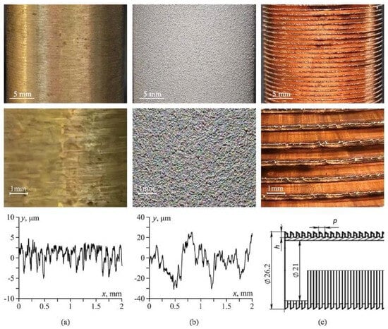 Schematic view of a cylinder without control methods and with different surface morphologies as passive cavitation control methods. Visual appearance (top row), close-up view (middle row) and characteristic surface profiles (bottom row) of the (a) smooth cylinder, (b) rough cylinder and (c) finned cylinder. Adapted from Ref. [55].