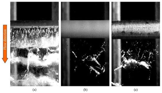 Photographs of the cavitation dynamics on the surface and in the wake of the cylinders for three wall morphologies, (a) smooth; (b) rough and (c) finned. Adapted from Ref. [55].