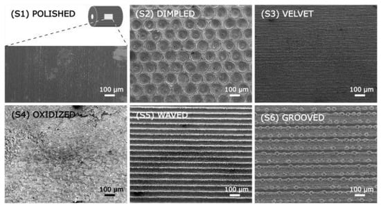 Zhao and Wang [83] conducted a numerical investigation on the passive management of cloud cavitation utilizing a bionic fin–fin structure on an NACA0015 hydrofoil. They reported a decrease in the hydrofoil’s average drag and a reduction in its lift. The bionic structure applied to the hydrofoil’s surface enhanced the lift-to-drag ratio. Furthermore, the bionic shape can significantly decrease kinetic energy, resulting in a more stable flow compared to the hydrofoil lacking a bionic structure. Yang et al. [84] numerically examined a passive cavitation control method by incorporating two bio-inspired structures into a hydrofoil design. Their analysis revealed that this integrated configuration suppressed cavitation development and lowered the total cavity volume by about 43%. In addition, the approach enhanced flow-field stability, reducing fluctuations in the pressure coefficient on the suction side of the hydrofoil by nearly 46.55%. Figure 6 shows a schematic view of a polished cylinder and laser-textured cylinders with various surface morphologies, such as dimpled, velvet, oxidized, waved and grooved surface, using a scanning electron microscope (SEM) and a 3D optical Infinite-Focus Measuring (IFM) device. Kumar et al. [85] numerically investigated the cavitation control on an NACA0018 hydrofoil using a surface cavity mounted on the suction surface of the foil. According to this study, an enhancement of about 7% and 3.1% in the lift-to-drag ratio was obtained for the hydrofoil with a surface cavity compared to the unmodified hydrofoil at high and low cavitation numbers, respectively.