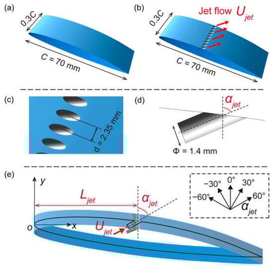 Schematic view of a hydrofoil with water injection as an active cavitation control method. (a) Original hydrofoil without injection, (b) Modified hydrofoil with water injection, (c) Details of the jet hole distance, (d) Diameter of the jet hole and (e) Graphical interpretation for three variable parameters. Adapted from Ref. [103].