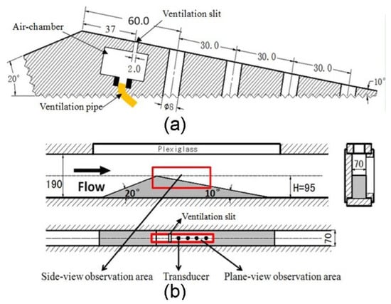 Schematic view of a test section of an air injection as an active cavitation control method on a convergent–divergent channel. (a) A transducer mounting and ventilation slit and (b) test section and test model of convergent–divergent channel. Adapted from Ref. [89].