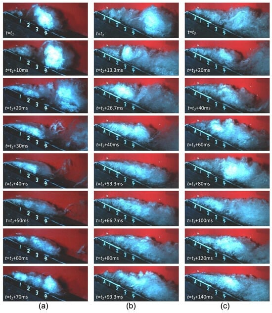 The experimental results of cloud cavitation dynamics on a convergent–divergent channel under different injection rates: (a) without injection; (b) with air injection rate Qv = 1.135 × 10−3; and (c) with air injection rate Qv = 2.27 × 10−3. Adapted from Ref. [89].