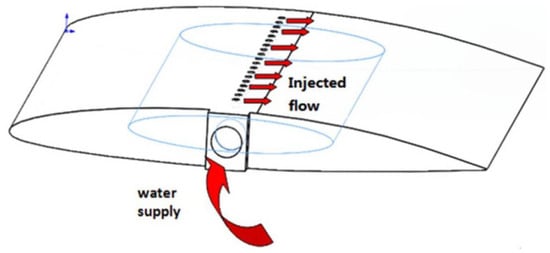 The effects of polymer injection on the dynamics of vortex cavitation have been studied [108,109,112]. Their results revealed that the pressure in the vortex core can be increased with this control technique by reducing the maximum tangential velocity along the vortex, thus delaying the cavitation inception. De Giorgi et al. [113] conducted a numerical investigation of an active control technique for unstable cavitation utilizing a single synthetic jet actuator surrounding an NACA0015 hydrofoil. Their findings demonstrated that the synthetic jet management method can achieve a reduction of 34.6% in average vapor content and 17.8% in average torsional load, respectively. Wang et al. [114] investigated how an actively controlled flexible surface influences and constrains cloud cavitation around a hydrofoil. Piezoelectric actuators with varying amplitudes and frequencies of actuation drive the flexible surfaces at three representative locations along the hydrofoil. They indicated that the cavity shedding mode from a large-scale shedding was changed to a small-scale shedding at the cavity closure with the cavitation control near the leading edge. Figure 11 shows a schematic view of a hydrofoil with water injection as an active control method for cavitation.