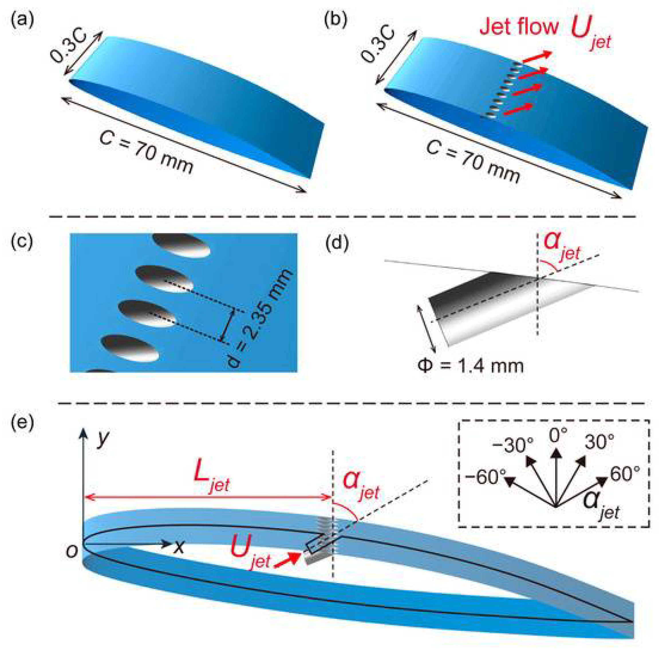 | Gu et al. (2023) [102] | Numerical | Bionic jet-shark gill slit jet structure | Reduction in time-averaged volume fraction by 46% compared at jet position of 0.6C, improvement of lift-to-drag ratio. |