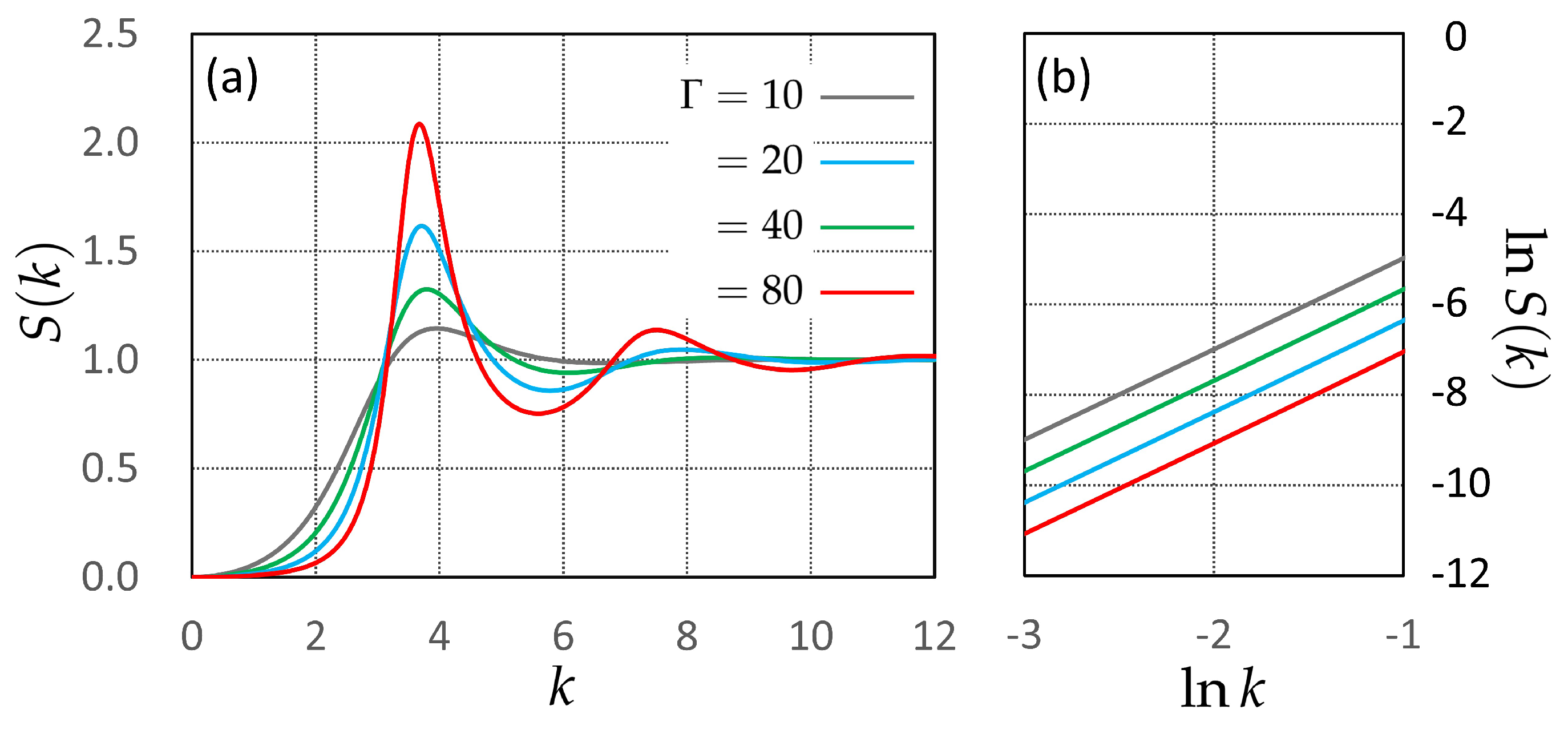 - Ng, K.C. Hypernetted chain solutions for the classical one-component plasma up to Γ = 7000. J. Chem. Phys. 1974, 61, 2680–2689. [Google Scholar] [CrossRef]