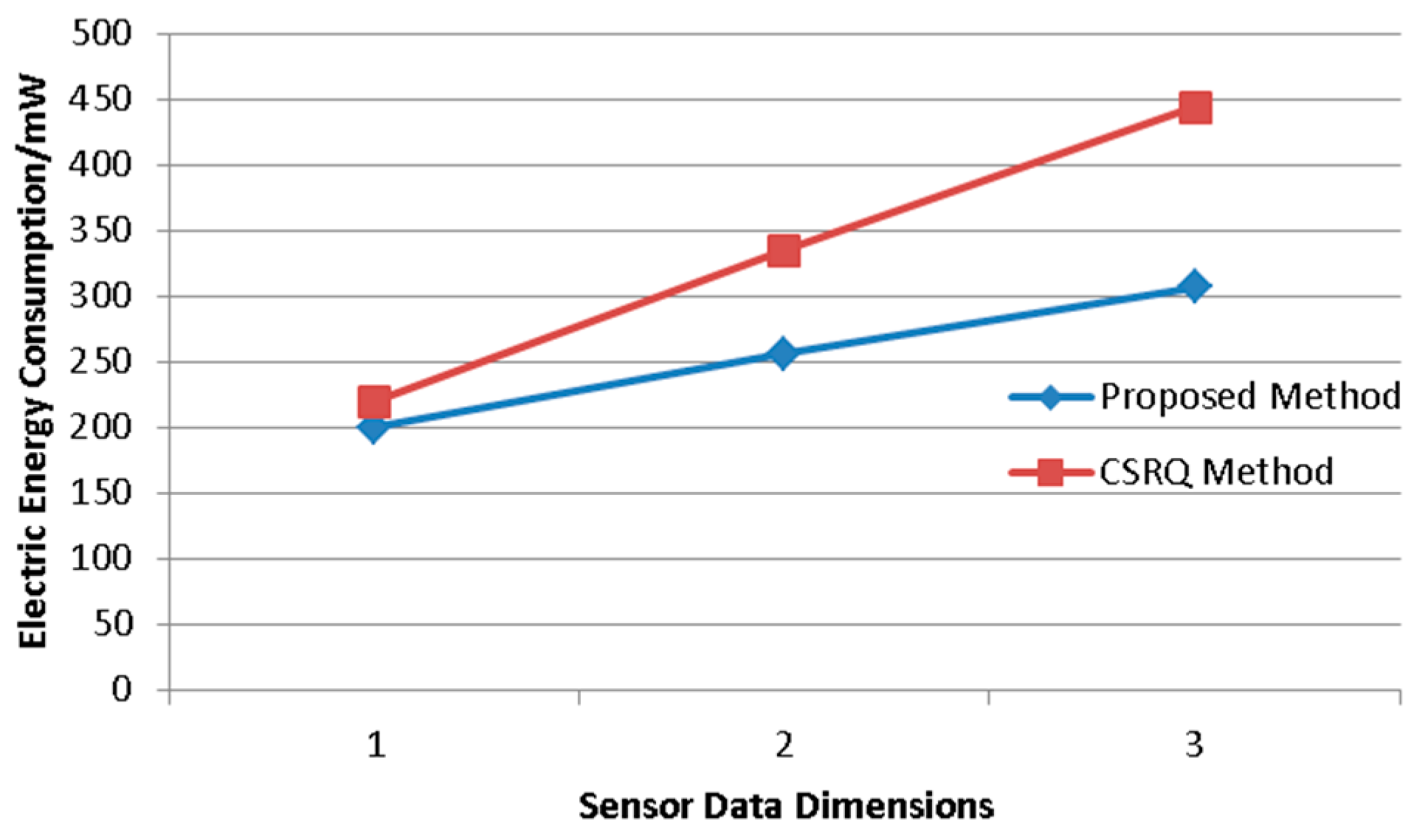 When the dimension of sensor data obtained by the sensing node increases, it is necessary for the CSRQ method to perform AES encryption and data sorting operations on the data with each dimension. Therefore, as the data dimension increases, the amount of calculation will gradually increase, and the amount of data will increase as the dimension increases. Compared to the CSRQ method, our method will increase the message even after the dimension increases; our method just needs to obtain the maximum comparison chain, and the cost of the increased message is limited. The energy consumption is lower when the data dimension is higher.