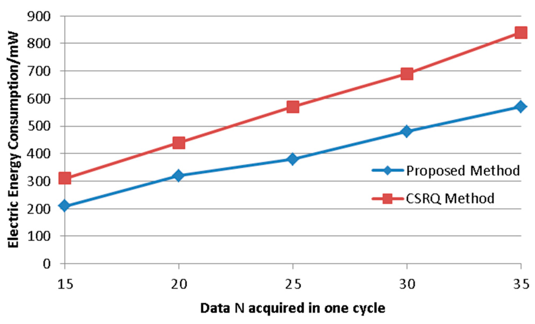 Experiment 2 is similar to Experiment 1. The data to be uploaded will increase dramatically when the data collection increases within the cycle. The time for the CSRQ data comparison chain will increase significantly as the number of data increases. In addition, the CSQR method must sort each set of data, which also costs a lot of time. But there is no need for the method we propose to sort the data; only the maximum value comparison chain is generated. When the amount of data increases significantly, the energy consumption only will increase slowly, having some advantages over the CSRQ algorithm.