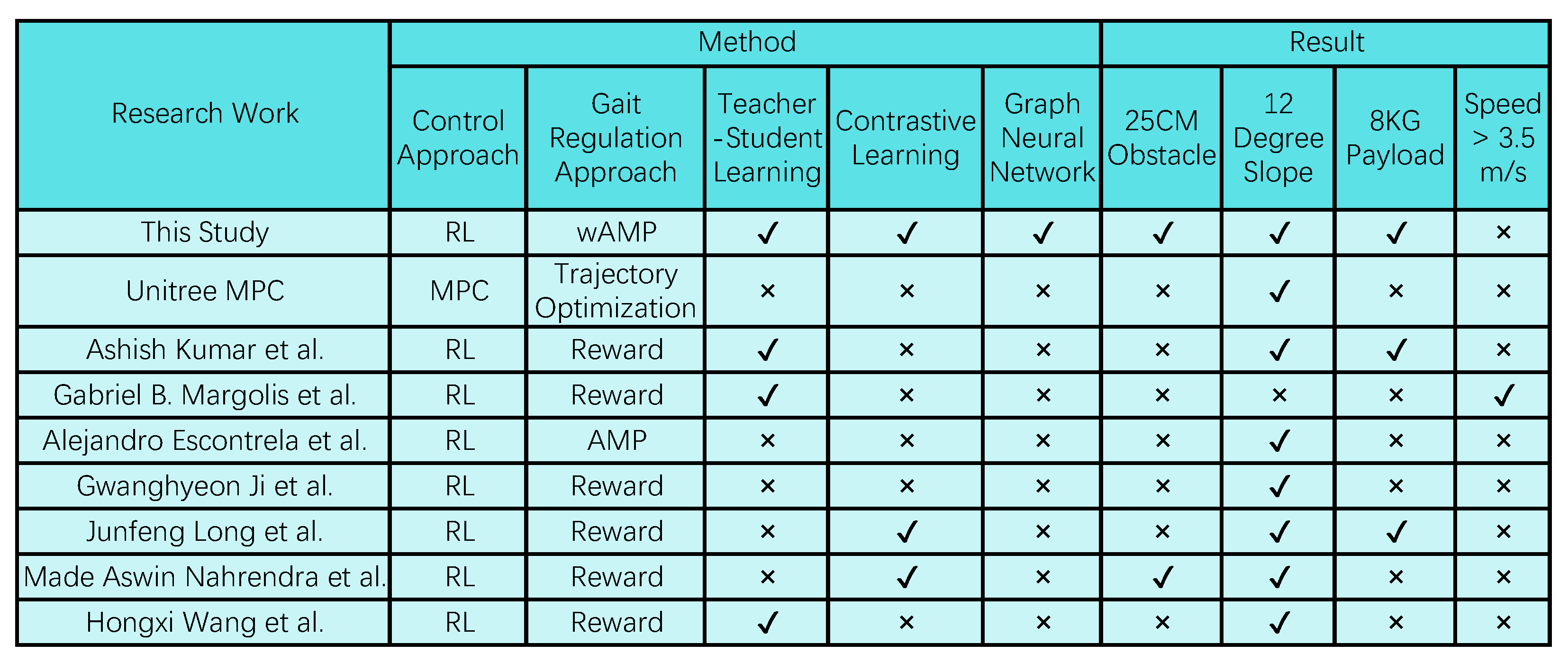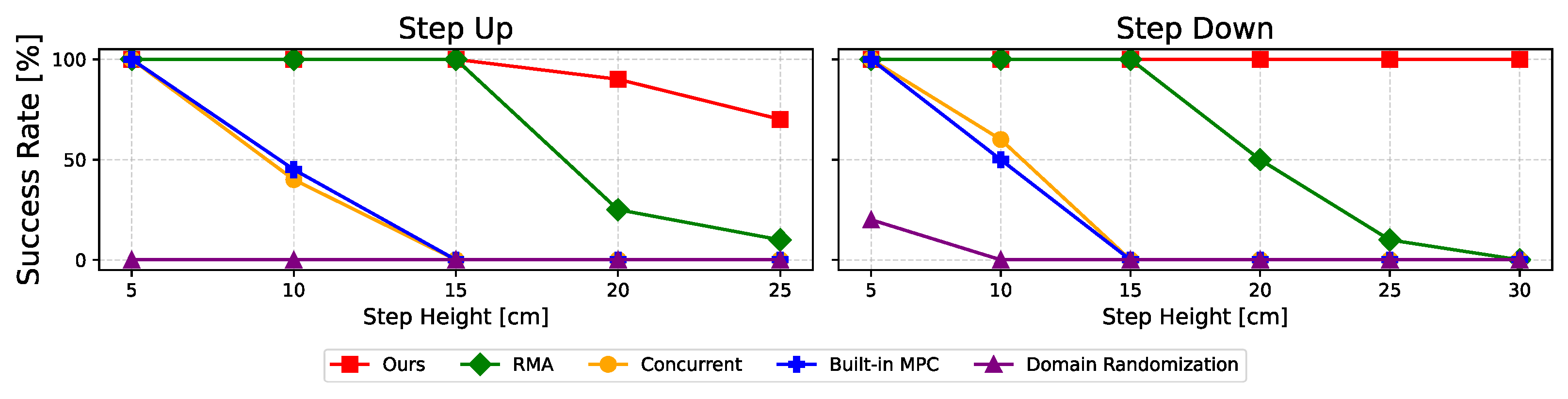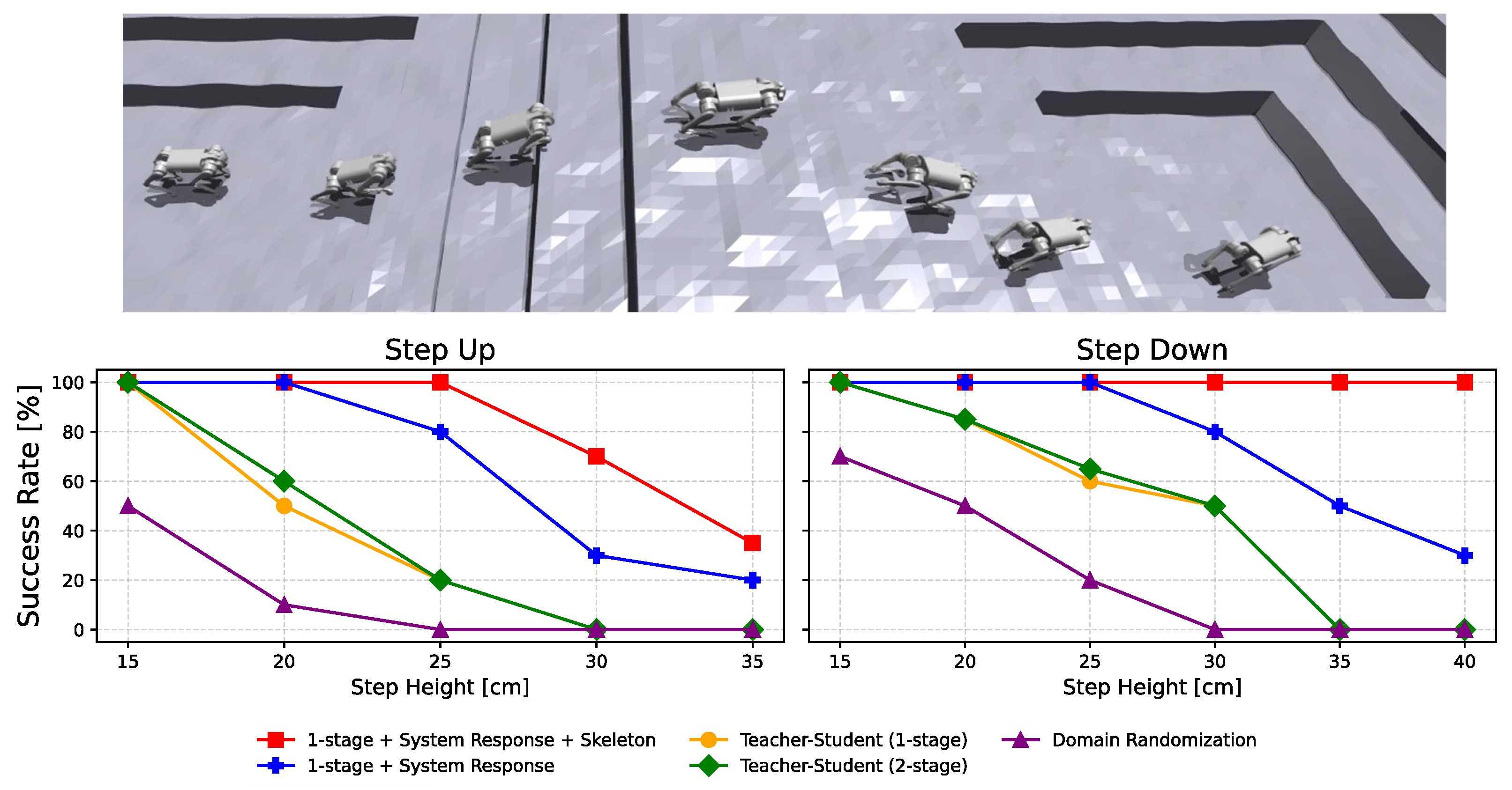 Each controller was evaluated in a single-step task using a remote-control command of 0.4 m/s. For each height of the step, the robot attempted to ascend or descend one step from the starting point, and a trial was considered successful if it completed the motion without falling. Each height was tested 10 times and the success rate was recorded. These experiments were carried out on the physical robot, and the results are reported in