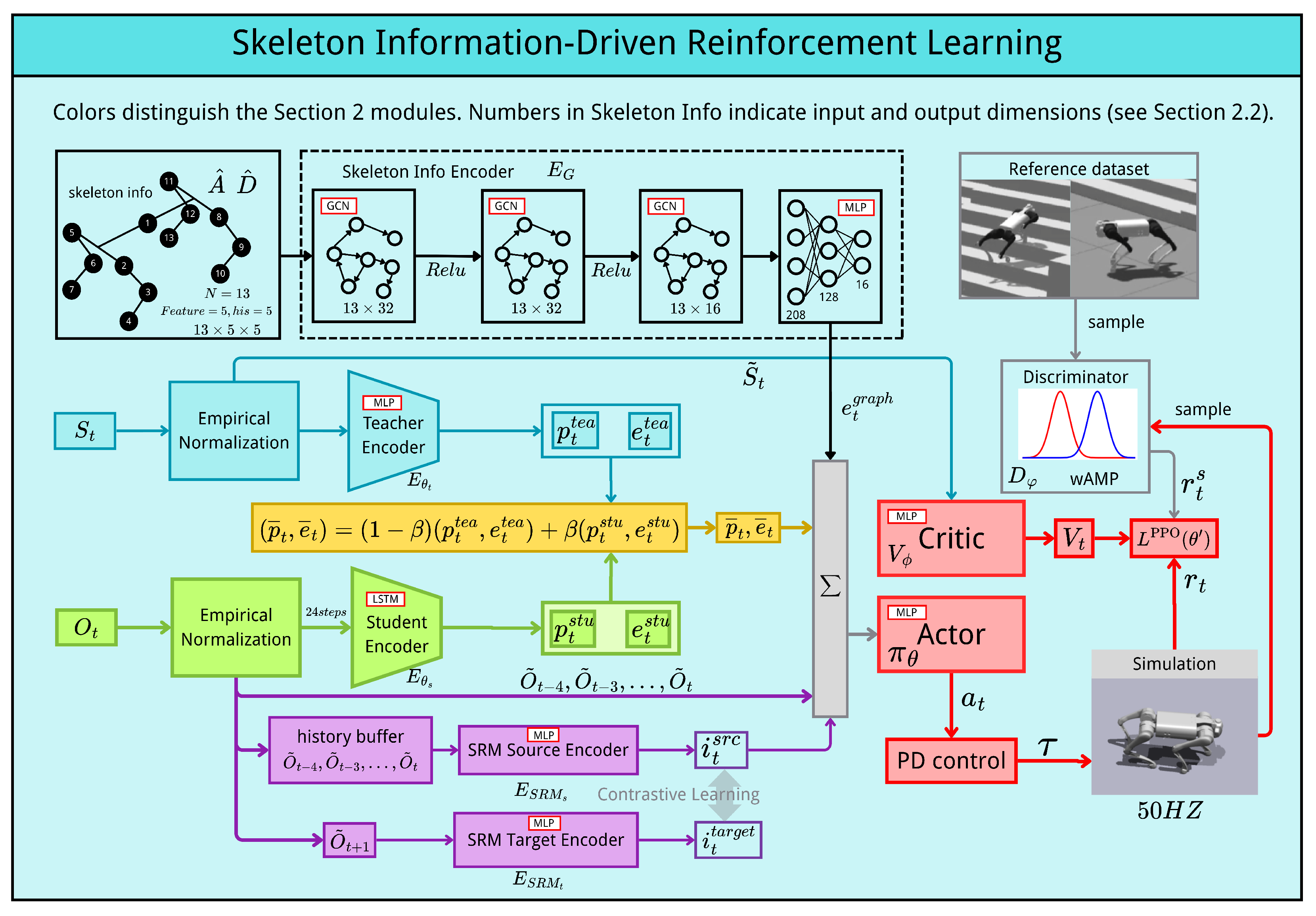 Encoder Processing. Different components of the state are processed by their respective encoders. The Student Encoder processes 24-step observation history through LSTM and MLP to produce embeddings and . The Teacher Encoder processes privileged and terrain information to generate and . The SRM Source Encoder processes 5-step observation history to extract dynamics embedding . The Skeleton Encoder uses GCN and MLP to encode the robot’s morphology into .