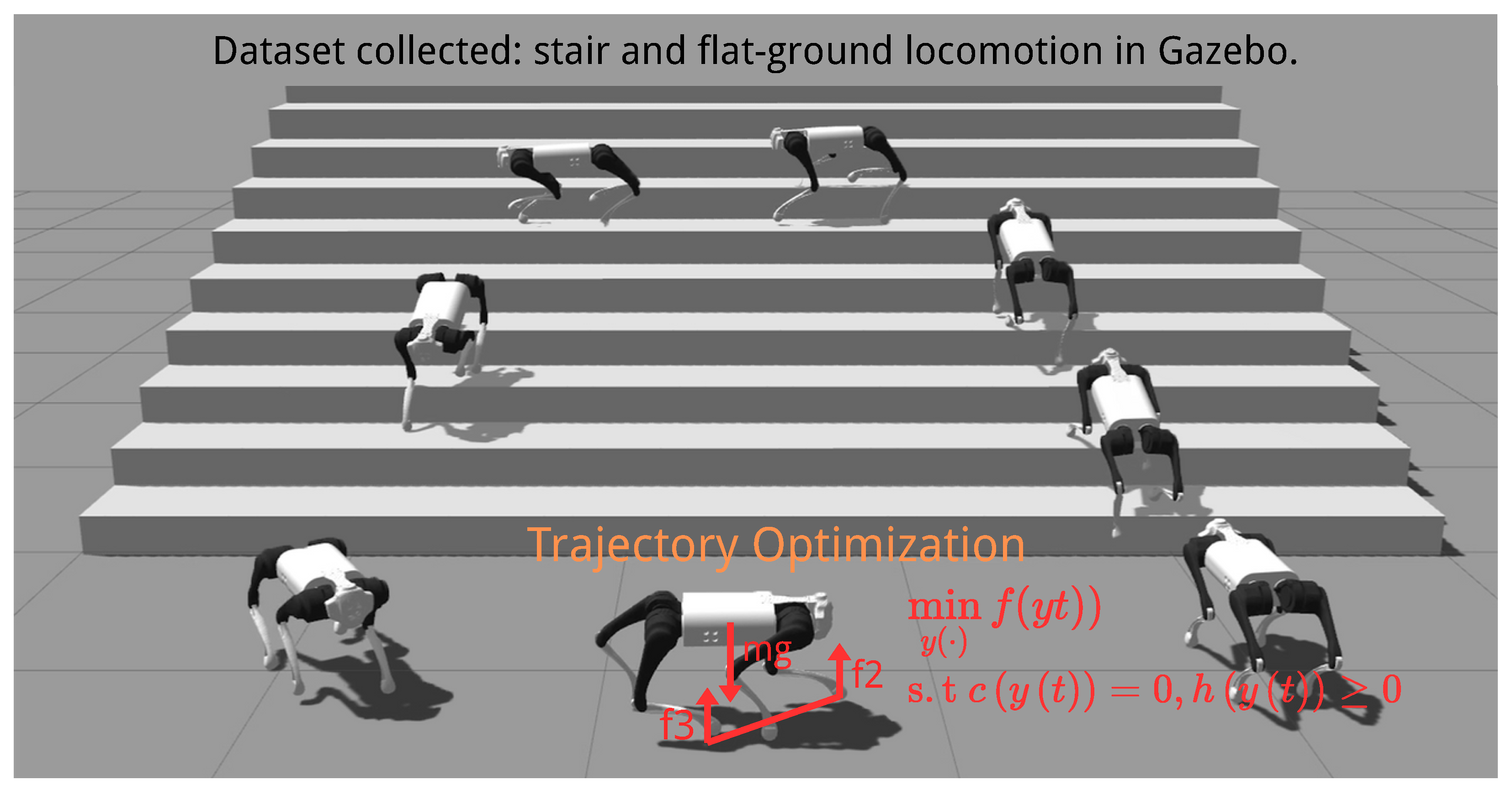 Figure 7, the trained policy enables the robot to perform various locomotion tasks, including obstacle crossing, stair climbing, recovery from missteps, and payload balancing. A demonstration of the quadruped robot locomotion and additional experiments are provided in the