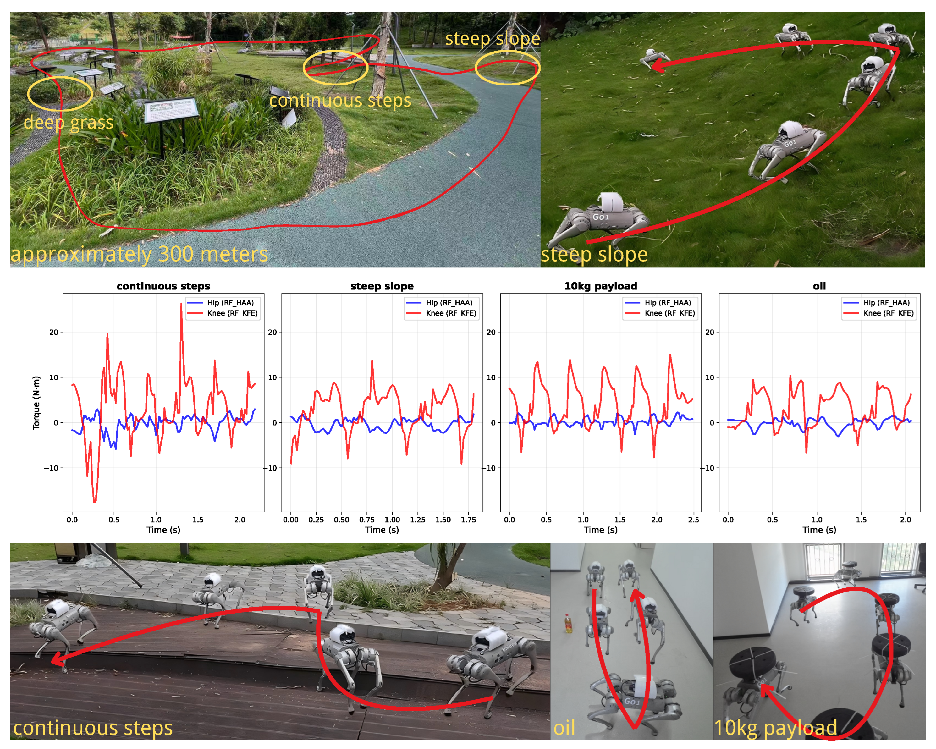 The experiment begins with a long-distance stability test in a park environment covering approximately 300 m, which includes steep slopes, consecutive steps, and dense vegetation. This extended traverse validates the policy’s ability to maintain consistent locomotion over prolonged periods while handling terrain variations. The torque measurements during this phase reveal how the robot continuously adjusts joint actuation to accommodate surface changes.