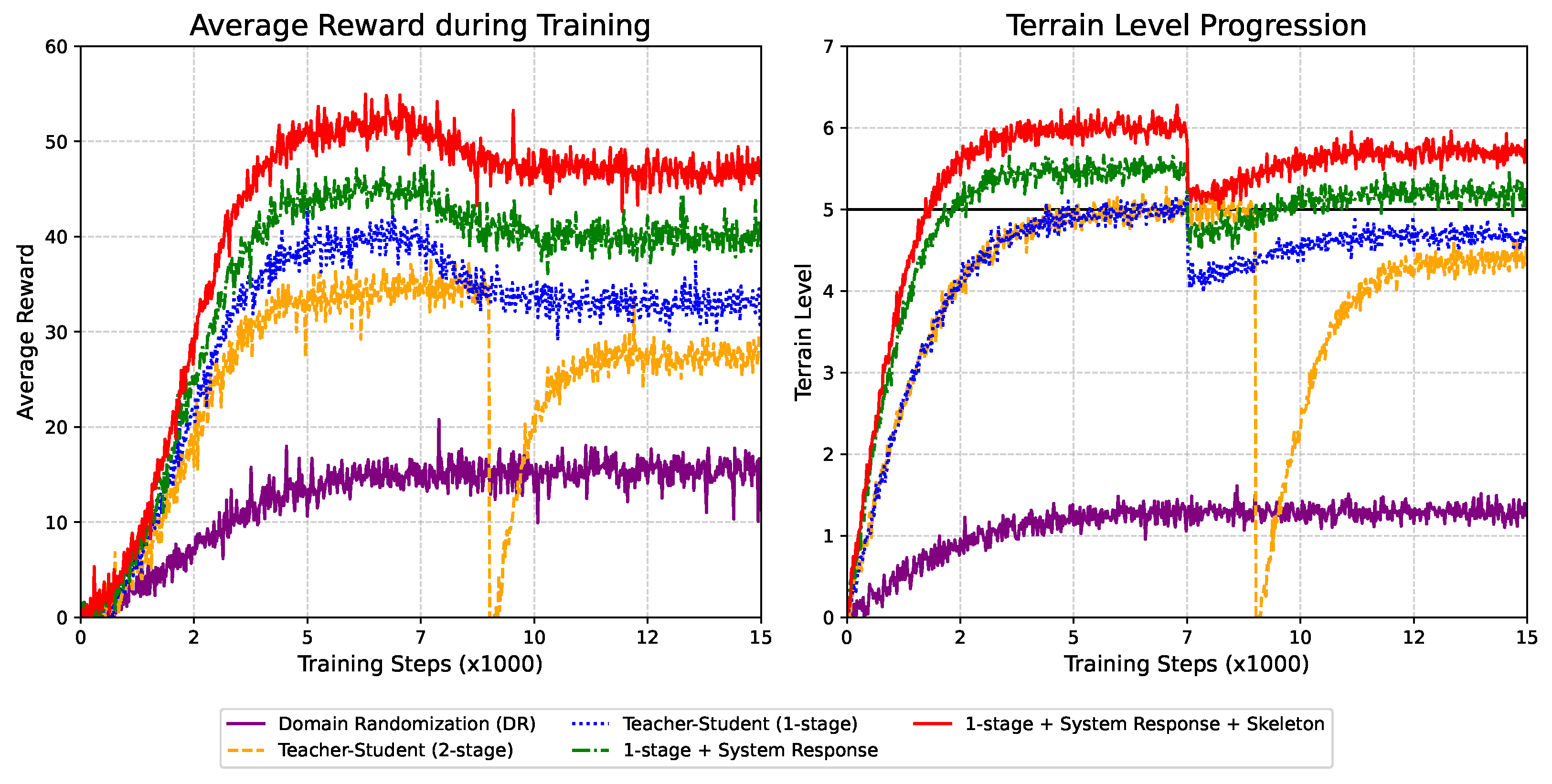 The training efficiency and terrain level of five representative strategies are analyzed. Domain Randomization (DR), Teacher–Student (2-stage), Teacher–Student (1-stage), 1-stage + System Response, and 1-stage + System Response + Skeleton. The evaluation metrics include: (i) the progression of cumulative rewards during training, which reflects the learning efficiency of each method, and (ii) the terrain level achieved during curriculum training, which indicates the adaptability to increasingly complex terrains.