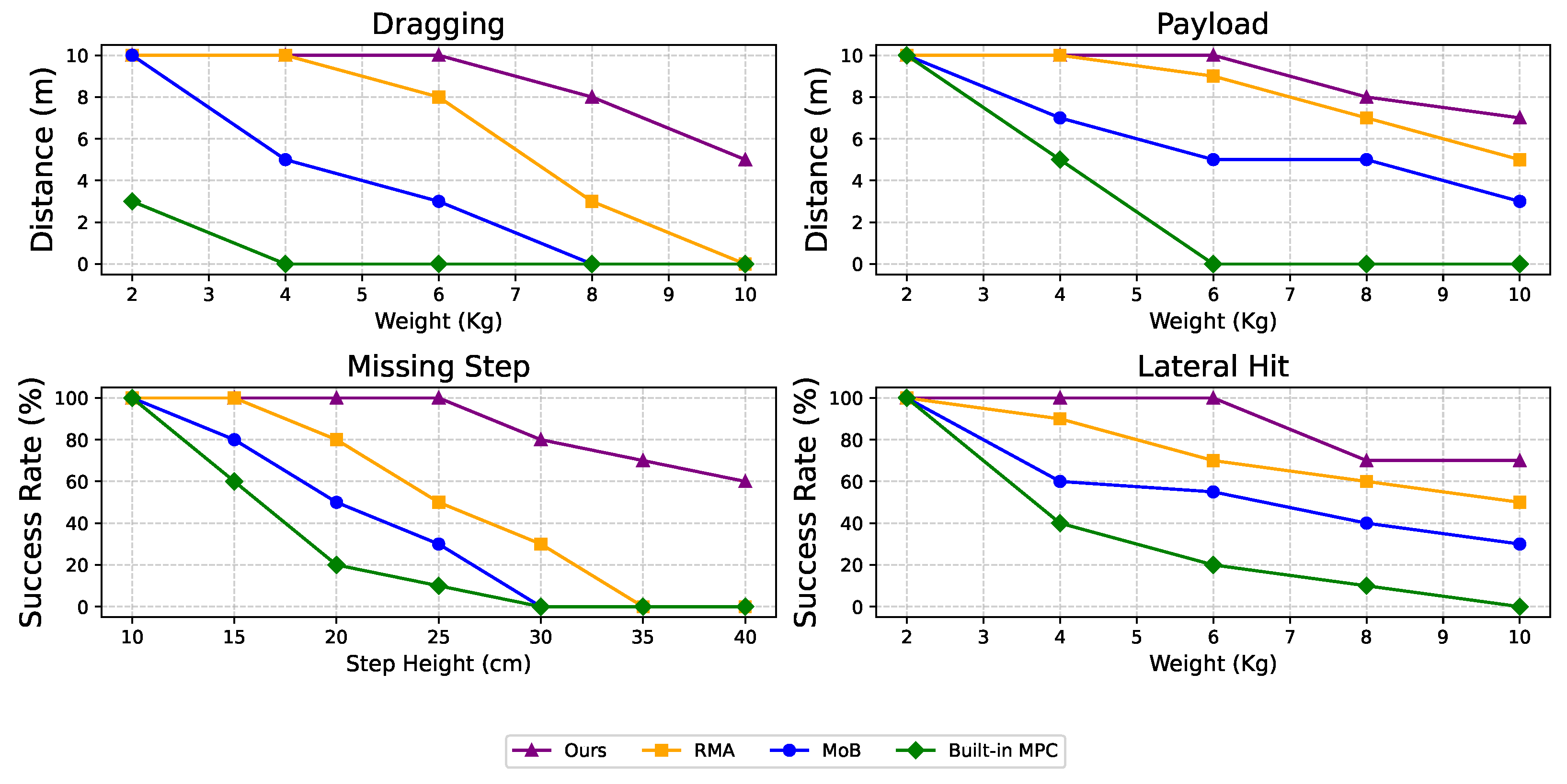 Figure 14, the method’s superior performance is a result of the effective integration of its core components. The system-response model allows the robot to proactively anticipate and compensate for external forces, making it exceptionally robust against payload and lateral hit disturbances. For the dragging test, the Graph Neural Network (GNN) encodes skeletal information, providing the policy with a deeper awareness of its own physical state under tension. Finally, success in the missing step test is a direct result of the specialized terrain curriculum, which trains the robot to handle complex vertical transitions by distinguishing between different ground surfaces and obstacles. This combination of proactive control, enhanced body awareness, and specialized training enables the method to consistently outperform other approaches.
