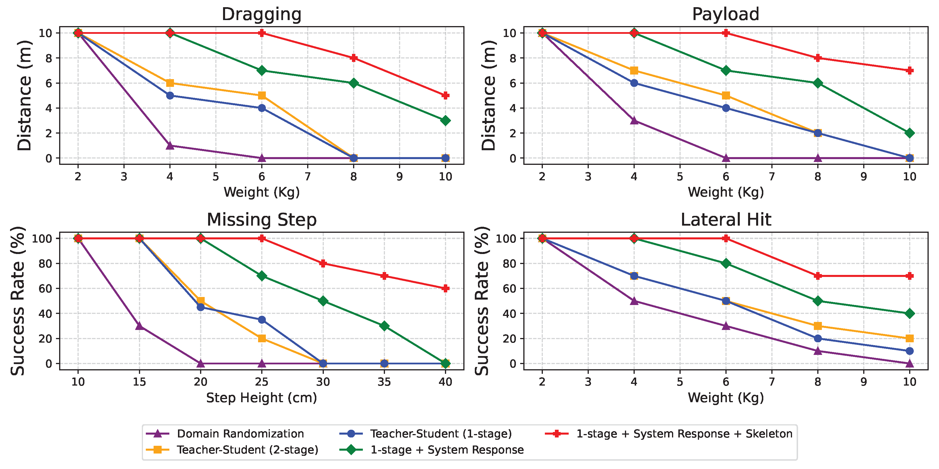 Figure 13, the approach demonstrates significantly improved robustness, outperforming all baseline methods against external perturbations. Although domain randomization allows other methods to handle payload and lateral impacts effectively, our approach demonstrates superior performance in dragging and missing-step scenarios. This is primarily attributed to the method’s ability to utilize skeletal information, allowing the robot to better detect when its rear feet are being dragged or its front feet miss a step.
