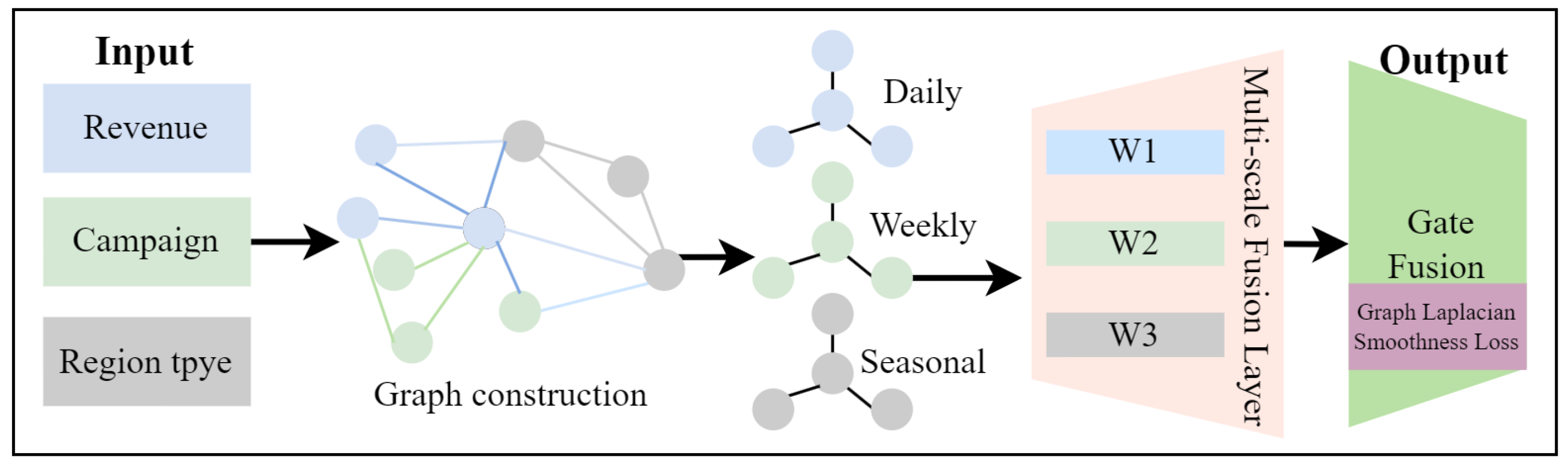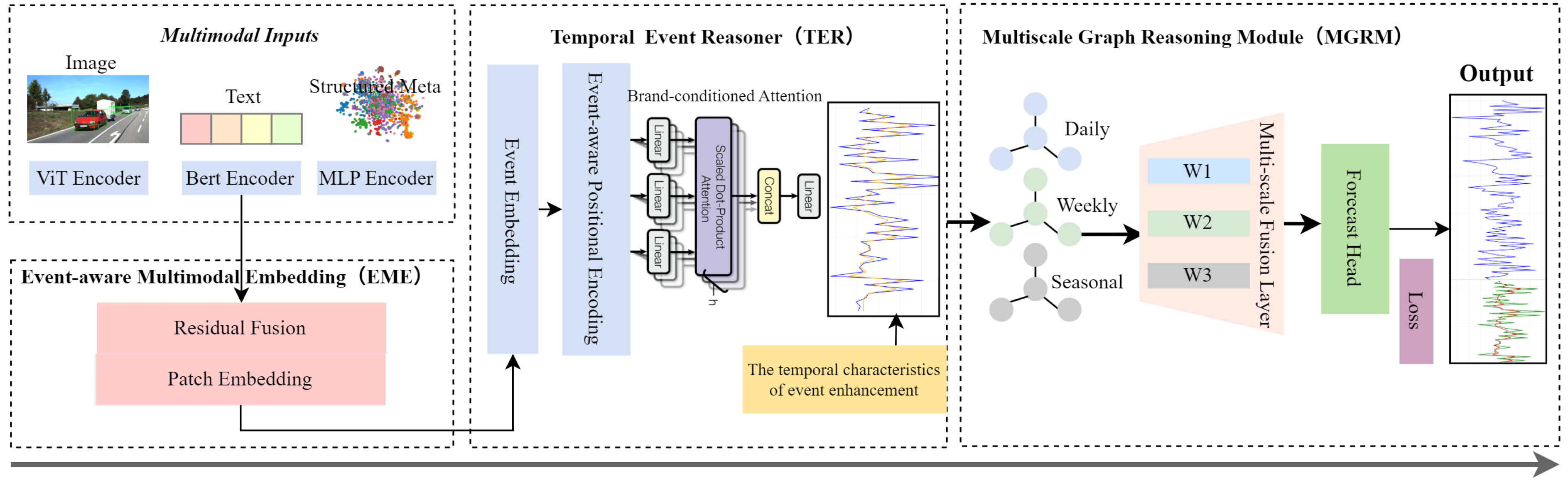 7], the framework integrates temporal modeling, multimodal semantic fusion, and structural transferability within a unified architecture. It incorporates a Multimodal Encoder (EME) for adaptive fusion of temporal, textual, and visual inputs; a Temporal Event Reasoner (TER) for capturing high-impact time windows associated with events such as interventions, campaigns, or seasonal surges; and a Multiscale Graph Relevance Module (MGRM) for modeling inter-regional structural correlations to improve transferability and robustness. Extensive experiments on diverse multi-region multimodal datasets demonstrate that the proposed method not only achieves superior predictive accuracy compared with state-of-the-art baselines but also exhibits resilience under missing or noisy modality conditions. Furthermore, it adapts effectively to unseen regions with minimal fine-tuning and provides interpretable outputs through modality contribution analysis and attention visualization, enhancing trust and usability. This work advances the state of the art in multimodal time-series forecasting by addressing the intertwined challenges of event sensitivity, semantic richness, and cross-region generalization while offering practical implications for real-world decision-making in dynamic, data-rich environments.
