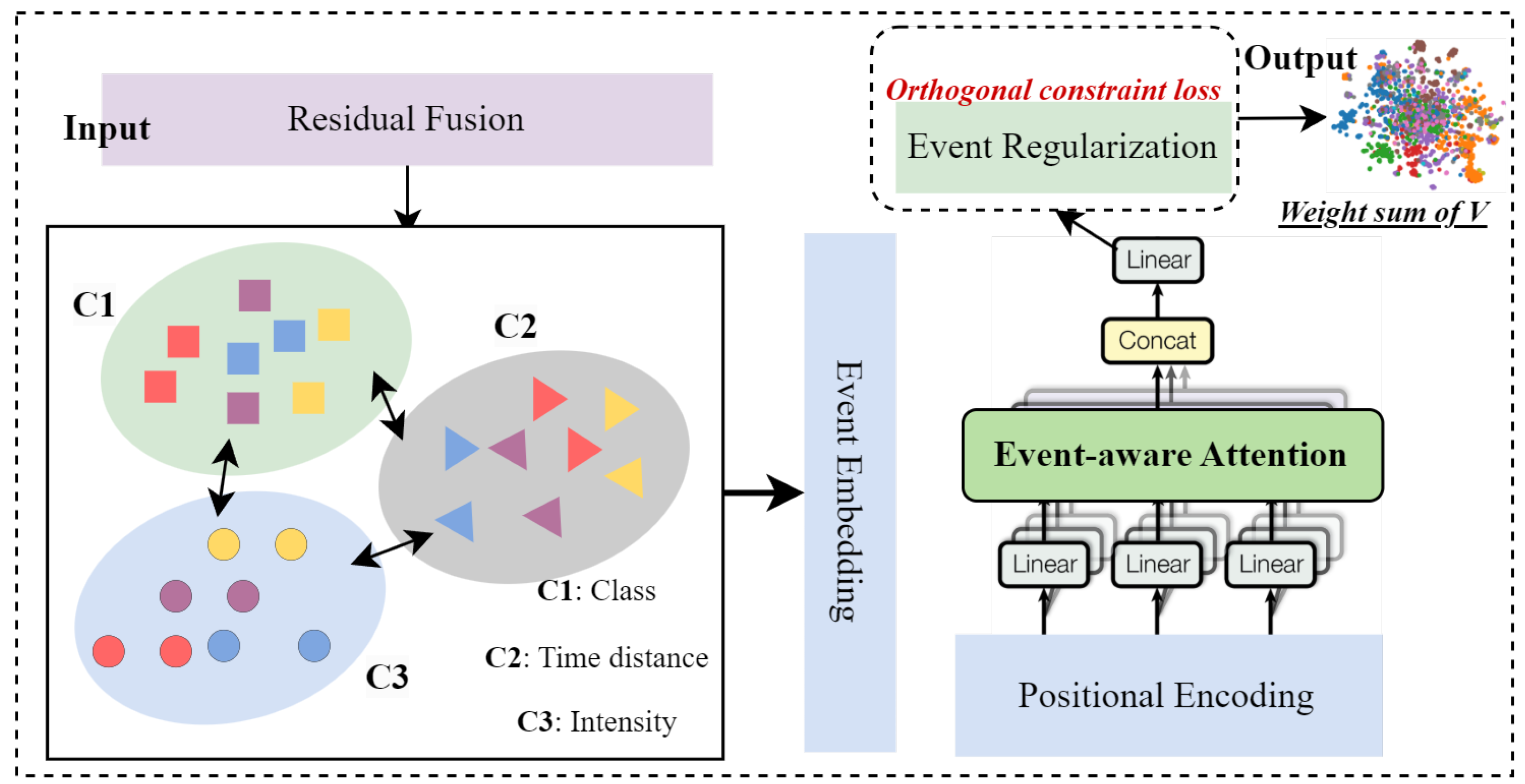 Following the multimodal encoding, event semantics are explicitly injected into the temporal dependencies using the Temporal Event Reasoning (TER) module. In this stage, event embeddings representing the category, temporal distance, and intensity are incorporated into positional encodings, and attention mechanisms are modulated by both temporal and event similarity. Orthogonality-based regularization is applied to enforce disentangled and discriminative event representations, enhancing the model’s sensitivity to abrupt shifts and latent correlations induced by heterogeneous events.