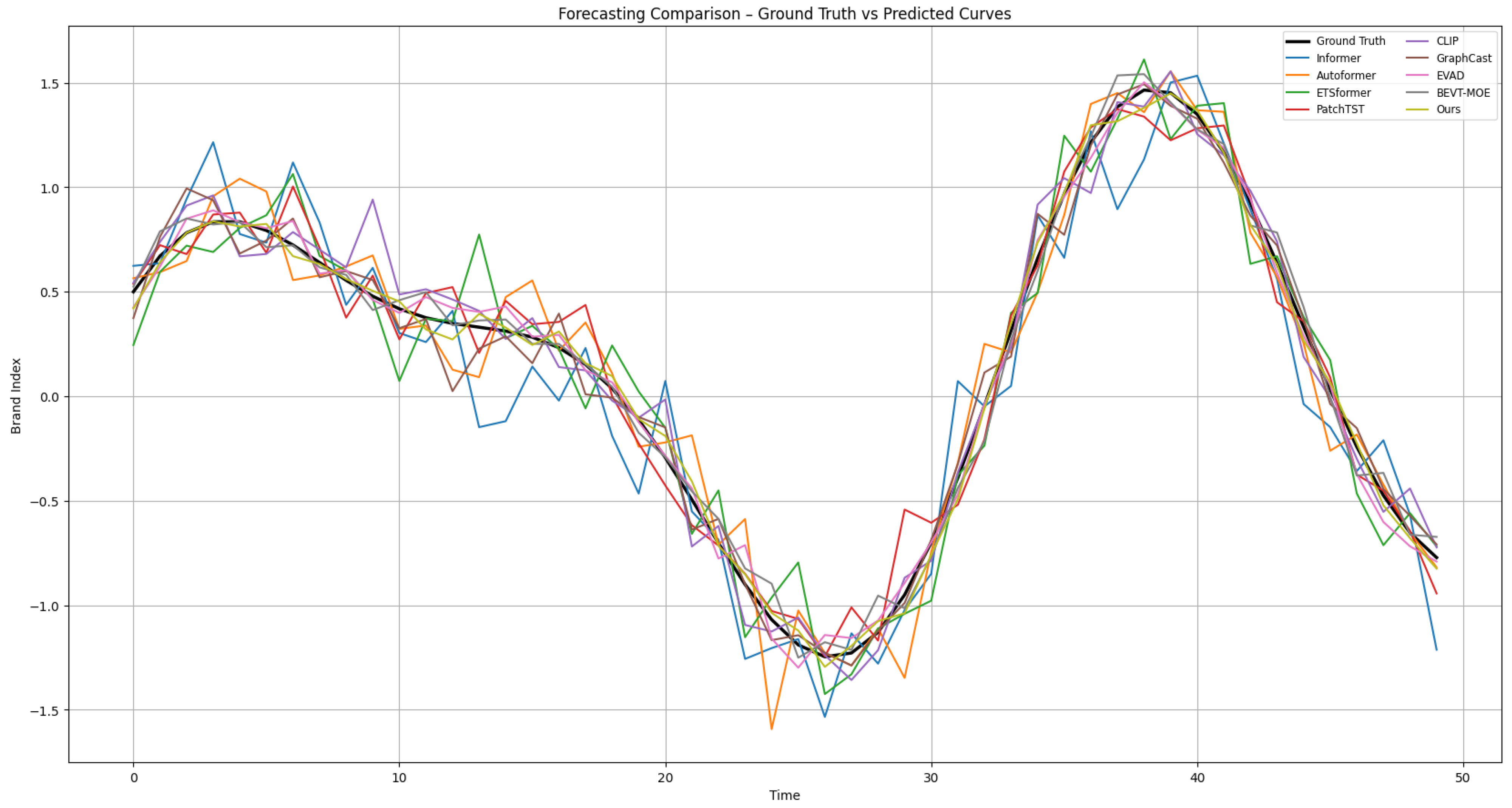 Figure 5, which compares predicted trajectories against the observed ground truth. While traditional baselines such as Autoformer and Informer show partial alignment during mid-period intervals, they often fail to capture abrupt seasonal shifts, and CLIP in particular exhibits lagged responses to sudden promotional spikes. In contrast, our model closely follows the ground truth curve even under sharp fluctuations, demonstrating stronger adaptability to exogenous event shocks. Complementary evidence is provided by